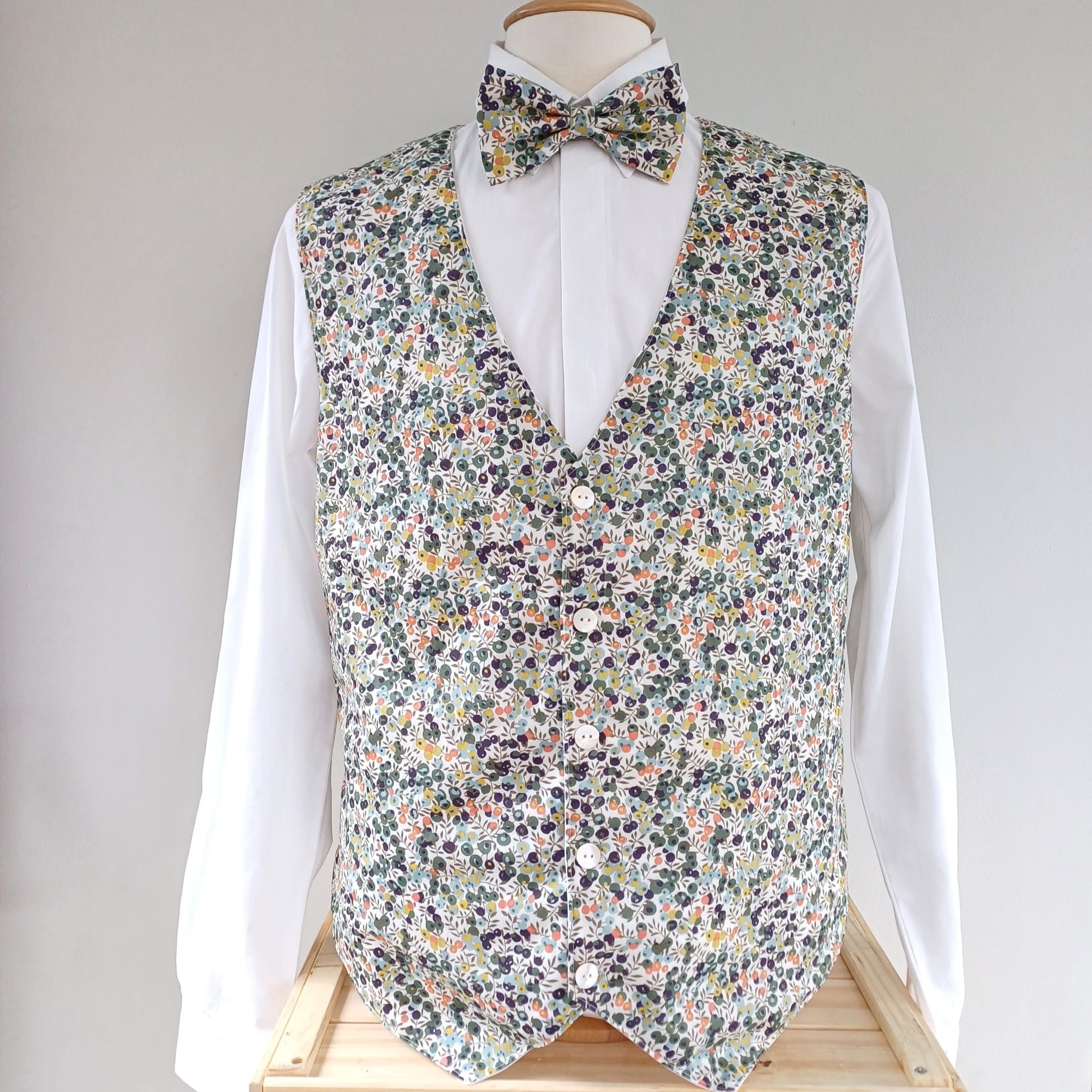 Sublimez votre tenue de cérémonie avec ce gilet d’exception, confectionné à la main avec passion et un souci du détail inégalé. Chaque point révèle un savoir-faire artisanal authentique, faisant de cette pièce un véritable atout de style. Réalisé dans un somptueux tissu Liberty Fabrics, ce gilet se distingue par son délicat imprimé de petites baies dans une rafraîchissante palette de tons vert, jaune, violet. La qualité incomparable et la finesse emblématique du tissu Liberty apportent une touche de nature et d’élégance à votre allure. Parfait pour un mariage, une réception ou toute autre cérémonie, ce gilet apportera une touche d’élégance naturelle et subtile à votre tenue.