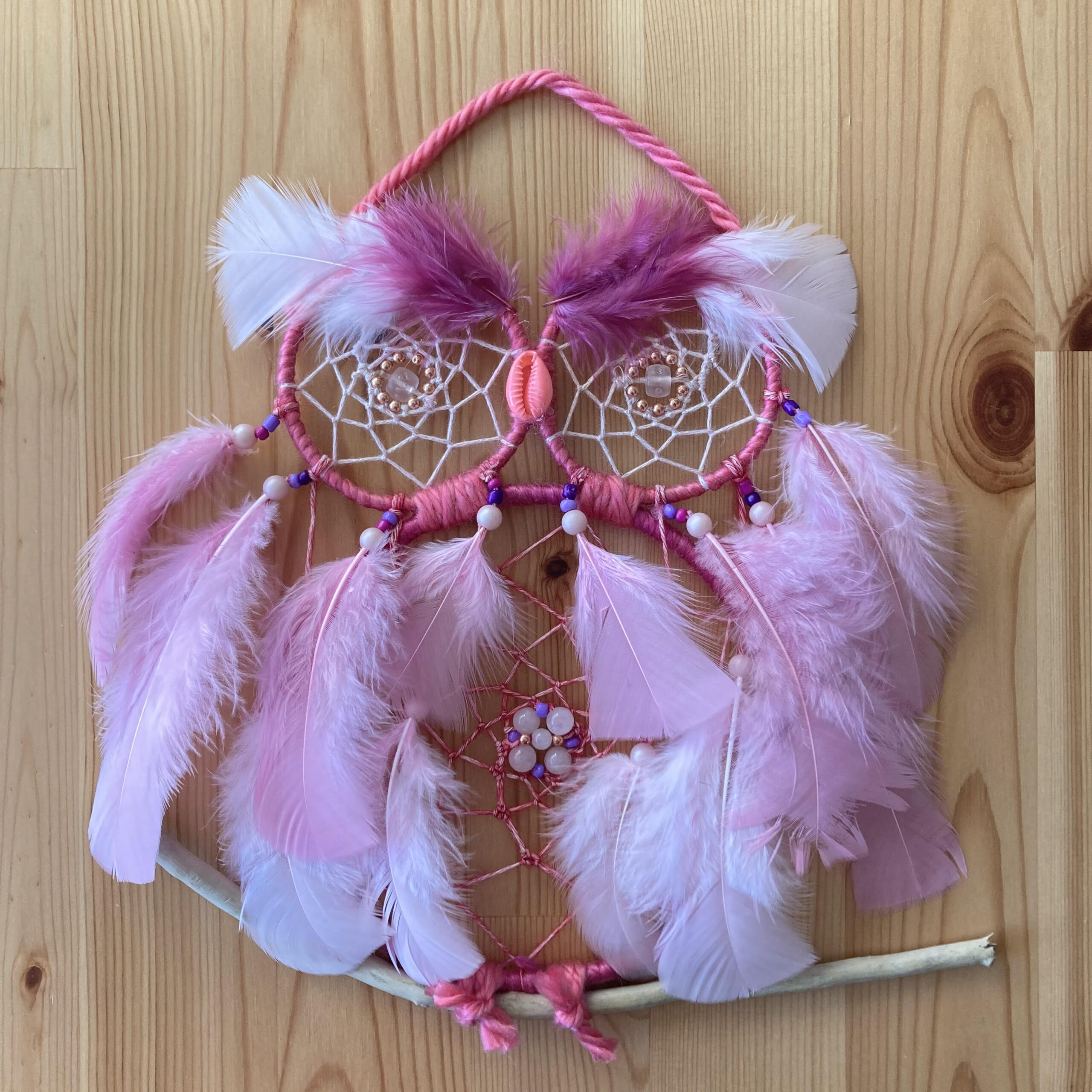 Attrape rêve hibou, une signature NiceDream. ils sont tous agrémentés de pierres vibratoires reconnues en lithothérapie. Ils sont uniques et possèdent chacun leurs vibrations. Trois tailles sont disponibles.