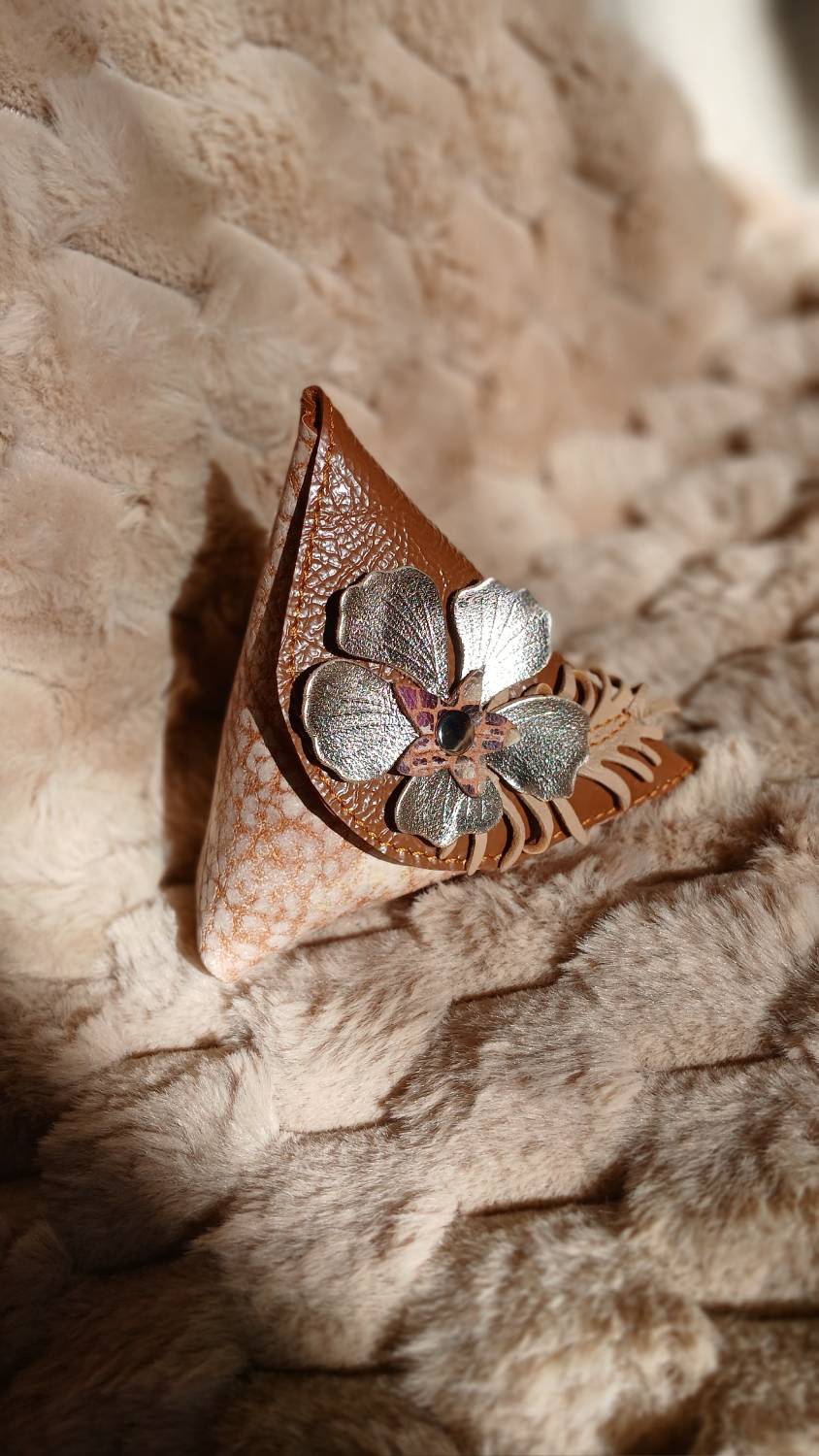Le porte-monnaie « Liège » est un accessoire de maroquinerie écoresponsable qui allie élégance et féminité. Son corps avant présente un cuir aux tons beige et marron légèrement mélangés, offrant un effet naturel et texturé rappelant l’écorce. L’arrière et le rabat, en cuir marron et brillant, apportent une touche lumineuse et raffinée. Sur le dessus, un motif floral artisanal capte l’attention : une feuille de fougère beige, une fleur gris argentée et une petite feuille beige aux pointes violettes créent un relief délicat et harmonieux. Tous ces éléments sont fixés grâce à un rivé en métal argenté, sobre et élégant. La fermeture aimantée se fait discrète et pratique, pour un usage quotidien facile. Compact et entièrement façonné en cuirs surcyclés, le porte-monnaie « Liège » combine praticité, esthétisme et singularité. C’est une pièce unique faite à la main, qui affiche son style avec délicatesse.