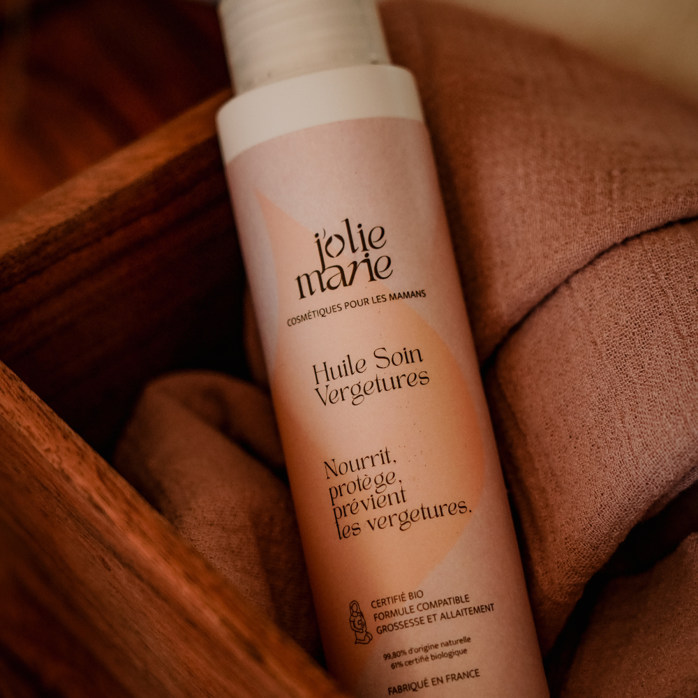 80% des femmes enceintes développent des vergetures. La bonne nouvelle ? Elles peuvent être prévenues avec les bons soins appliqués au bon moment. Notre Huile Vergetures Bio nourrit intensément votre peau pour préserver son élasticité tout au long de la grossesse et après l’accouchement. Ce qu’elle fait pour vous : Prévient l’apparition des vergetures — renforce l’élasticité de la peau Atténue les marques existantes — améliore l’aspect des vergetures récentes Texture sèche non grasse — pénètre rapidement, sans effet gras Enrichie en huile d’olive bio : Riche en vitamine E et antioxydants naturels, elle favorise la régénération cellulaire et nourrit en profondeur. 99,8% d’ingrédients naturels, certifiée bio. Utilisable dès le 1er trimestre et pendant l’allaitement. Complétez votre routine ! Associez votre Huile avec le Lait Corps Hydratant Bio pour une routine anti-vergetures complète, ou découvrez notre Rituel Maternité Complet incluant les 3 soins essentiels.