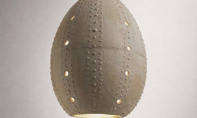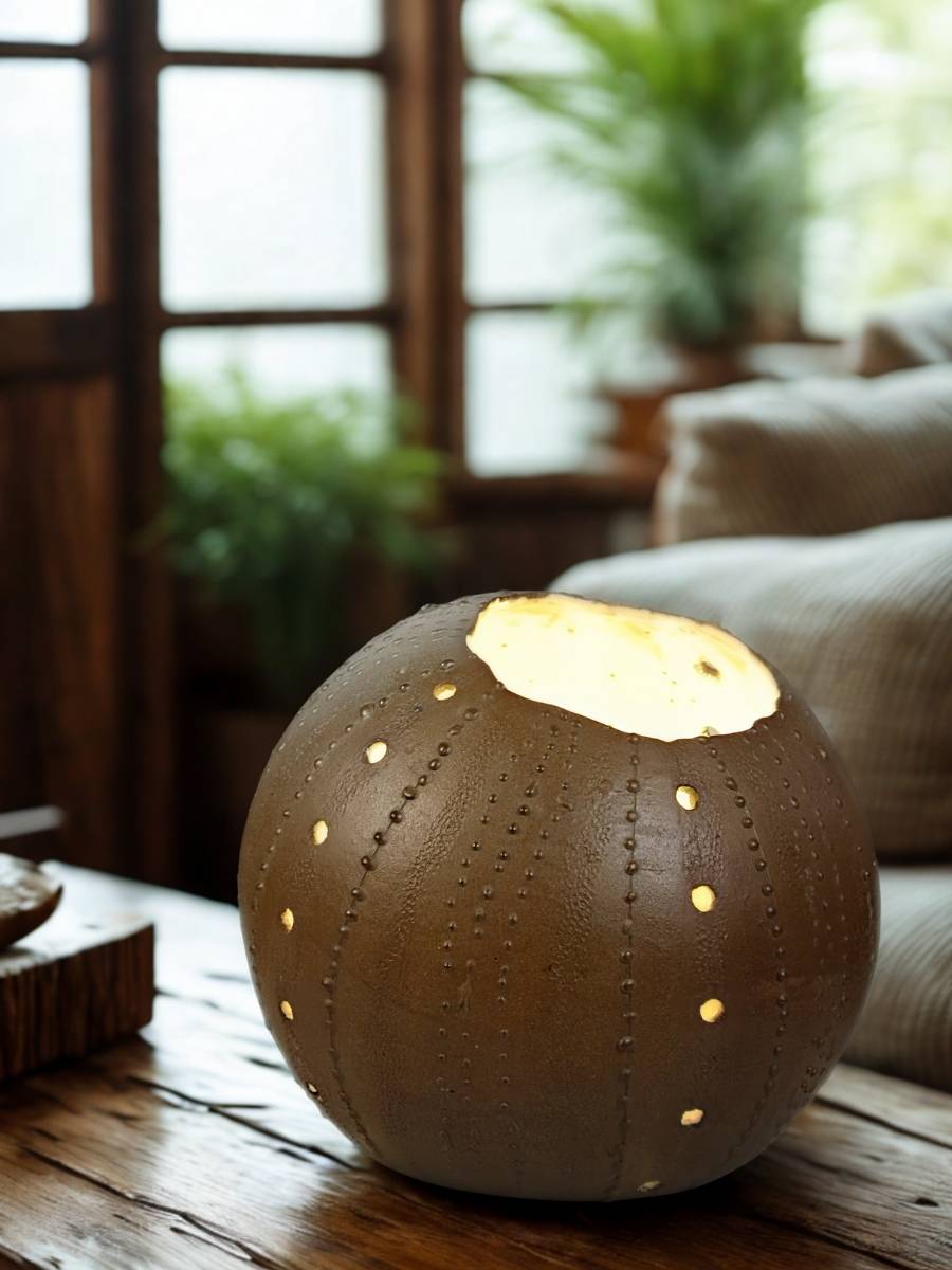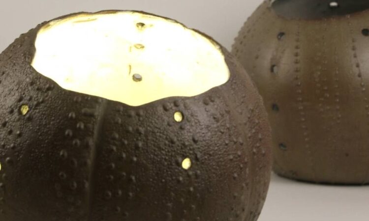OURSIN, Lampe à poser artisanale en grès brun chamotté et émaillage de cendre blanc. La matière texturée et les perforations créent des jeux de lumière inspirés du monde marin, pour un éclairage d’ambiance chaleureux.