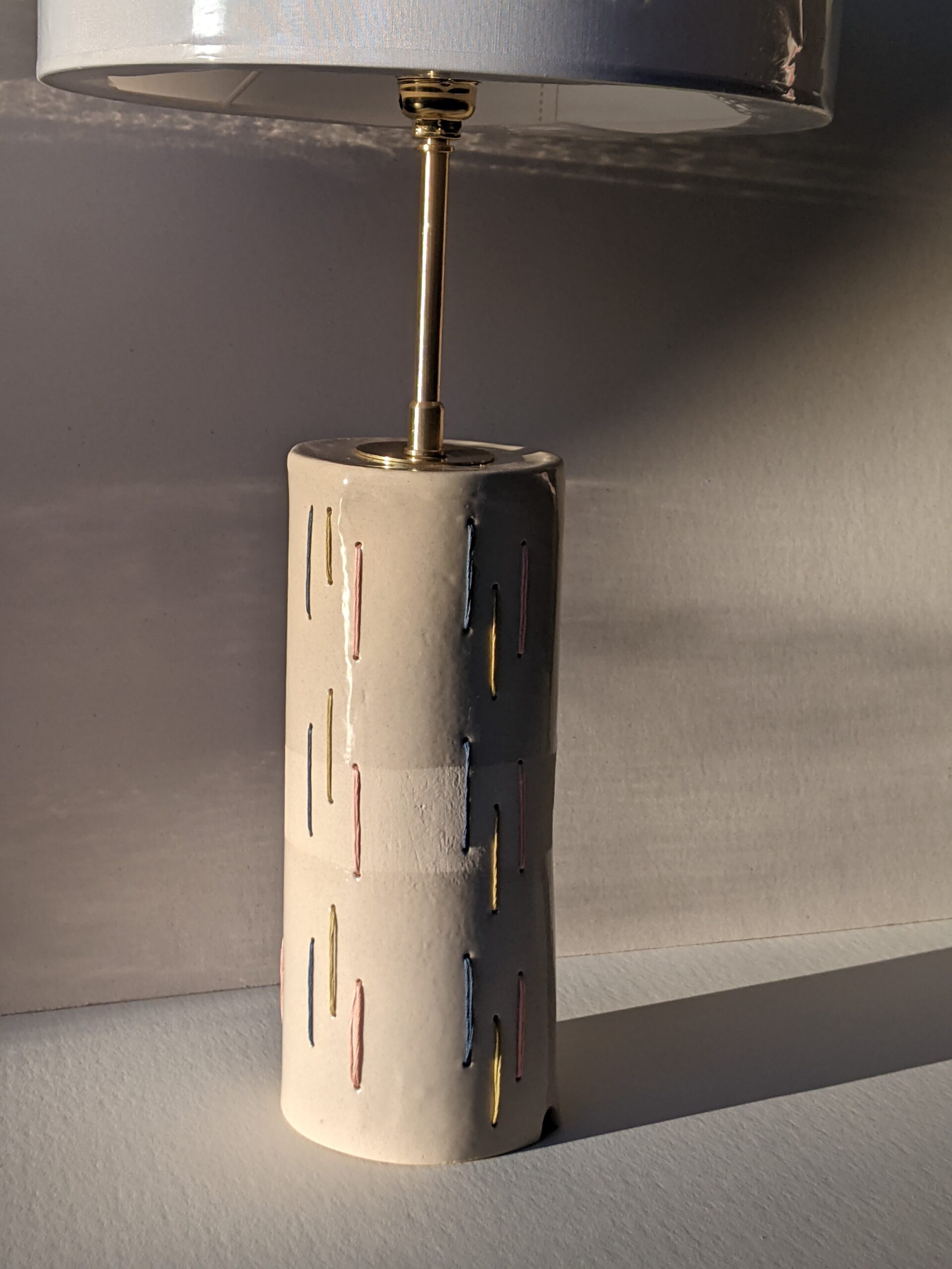 Lampe Mirage Grès et broderie En collaboration avec Clara Lopez, céramiste, maison mira Avec abat-jour : 25 x 25 x 40 cm – 250€