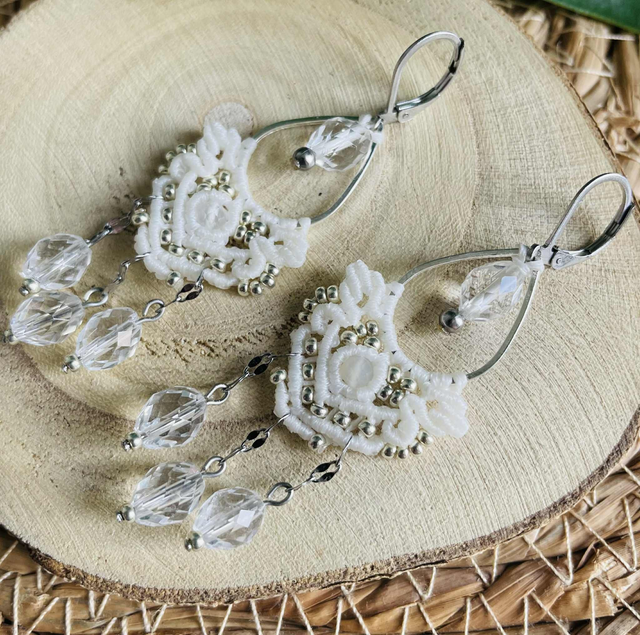 Boucles d’oreilles tissées à la main dans mon atelier du sud de la France . Le fil utilisé est un fil plat blanc de 0,8 mm , réputé pour sa grande solidité il assurera lingue vie à votre bijou. Les pierres utilisé sont des pierres de lunes blanche et cristal de roche. Les apprêts et breloques sont en acier inoxydable. On retrouve également des perles de rocailles miyuki duracoat argentées dans le tissage . Dimensions : Longueur : 6 cms , Largeur : 2 cms , Poids : 4 g .