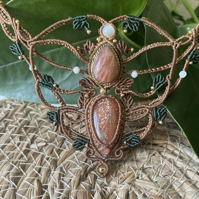 Collier tissé à la main en France avec la technique du micro macramé. . les pierres utilisées sont des cabochons de pierres de soleil , dont l’une est sertie de laiton doré , dans le tissage on retrouve des perles de nacre qui viennent illuminé le bijou. les perles de finitions sont des perles en acier inoxydable doré et des perles de rocailles miyuki duracoat doré. les fils utilisés sont des fils plats de 0,8m brun et vert forêt , réputés pour leur grande solidité , ils assureront longue vie à votre bijou . le collier est ajustable en longueur grâce à sa fermeture coulissante tissée