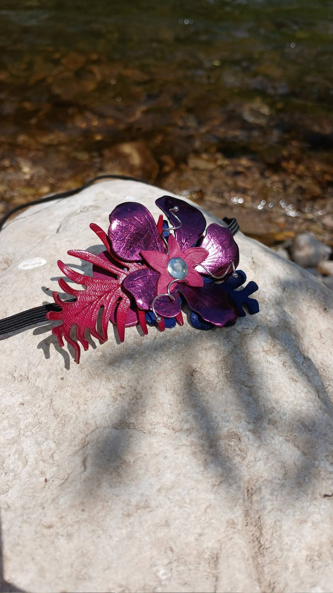 Le bijou de tête « Violetta » est un accessoire à la composition florale unique. En cuir upcyclé il est monté, sur un élastique noir. La fleur violette métallisée, au centre en violet non métallisé, s’accompagne de deux feuilles contrastées : l’une bleu marine et l’autre rouge vin. Pour une touche délicate, trois étamines argentées réalisées à partir d’accessoires pour boucles d’oreilles viennent rehausser l’ensemble. Ce bijou de tête apportera une note élégante et originale à vos tenues, tout en affirmant votre engagement pour une mode écoresponsable. Associez-le avec les autres créations de la catégorie Les « Complices Violetta ».