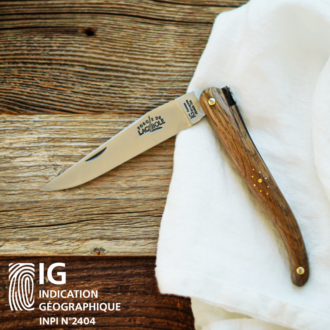 Un label qui fait sens : l’IG “Couteau de Laguiole” Reconnu par l’INPI, le label IG garantit que chaque couteau ainsi estampillé est conçu et fabriqué dans une aire géographique précise, selon un cahier des charges strict, protégeant les traditions coutelières locales. Forge de Laguiole prouve une fois encore son engagement : l’intégralité du couteau est réalisée dans notre atelier, de la forge de la lame jusqu’aux finitions du manche. Son manche de 12 cm est façonné dans un chêne subfossile vieux de plus de 5 000 ans, extrait de l’ancien lit du Rhin. Ce bois rare, chargé de mémoire, dialogue avec une lame forgée à chaud en acier français. Inspiré des premiers Laguiole fabriqués dans le village, ce modèle au design épuré et fonctionnel rend hommage à l’outil d’origine. La croix de Saint André, ciselée au-dessus de la lame, rappelle les armoiries protectrices d’André l’un des premiers doms d’Aubrac.