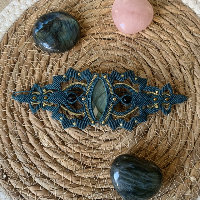 Manchette tissée à la main autour d’une magnifique labradorite facettée . Le fil utilisé est un fil linhasita en provenance du Brésil , réputé pour sa grande solidité il assurera logue vie à votre bijou . Dans le tissage vous retrouverez deux perles facettées de quartz fumé ainsi que des perles facettées d’hématite dorées et des perles en acier inoxydable doré. Le bracelet s’ajuste à tous les poignets à partir de 15cms grâce à son système de fermeture tissée coulissante . Je vous conseille d’ôter votre bijou lors de vos douches et baignades afin de le conserver dans les meilleures conditions possibles.
