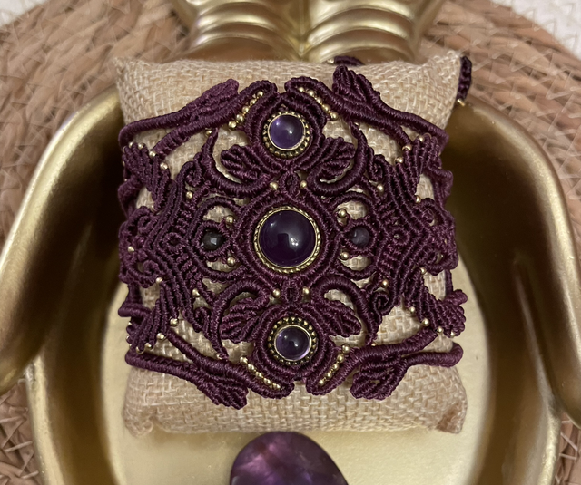 Manchette tissée à la main en France avec la technique du micro macramé qui tient son nom de l’elfique « Vael » qui signifie beauté et « ith » qui signifie nature . Au centre se trouve 3 cabochons d’Améthyste sertis de laiton doré et des pierres d’améthystes facettées de 4mm sont intégrées dans le tissage. Le fil utilisé est un fil plat prune de 0,75 mm , réputé pour sa grande solidité il assurera longue vie à votre bijou . Les perles de finition sont des rocailles miyuki dorées de 2 mm. La manchette est ajustable en longueur grâce à sa fermeture coulissante tissée. Taille : Longueur du tissage : 15 cms , Longueur totale : 32 cms , Largeur : 6,2 cms au plus large , Poids : 15 g