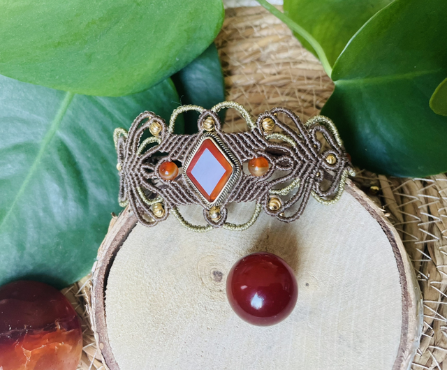 Bracelet tissé à la main en France avec la technique du micro macramé . La pierre centrale est une cornaline sertie de laiton doré , 4 pierres de cornaline de 6mm sont intégrées dans le tissage . Les perles de finitions sont des rocailles miyuki dorées et des perles en acier inoxydable. Le fil utilisé est un fil plat de 0,75 MM brun et un fil linhasita de 0,5 mm doré. La taille du bracelet est ajustable en longueur grâce à sa fermeture coulissante tissée. Taille : Longueur du tissage : 13 cms ; Longueur totale : 30 cms ; Largeur : 4 cms au plus large .Poids : 14 g
