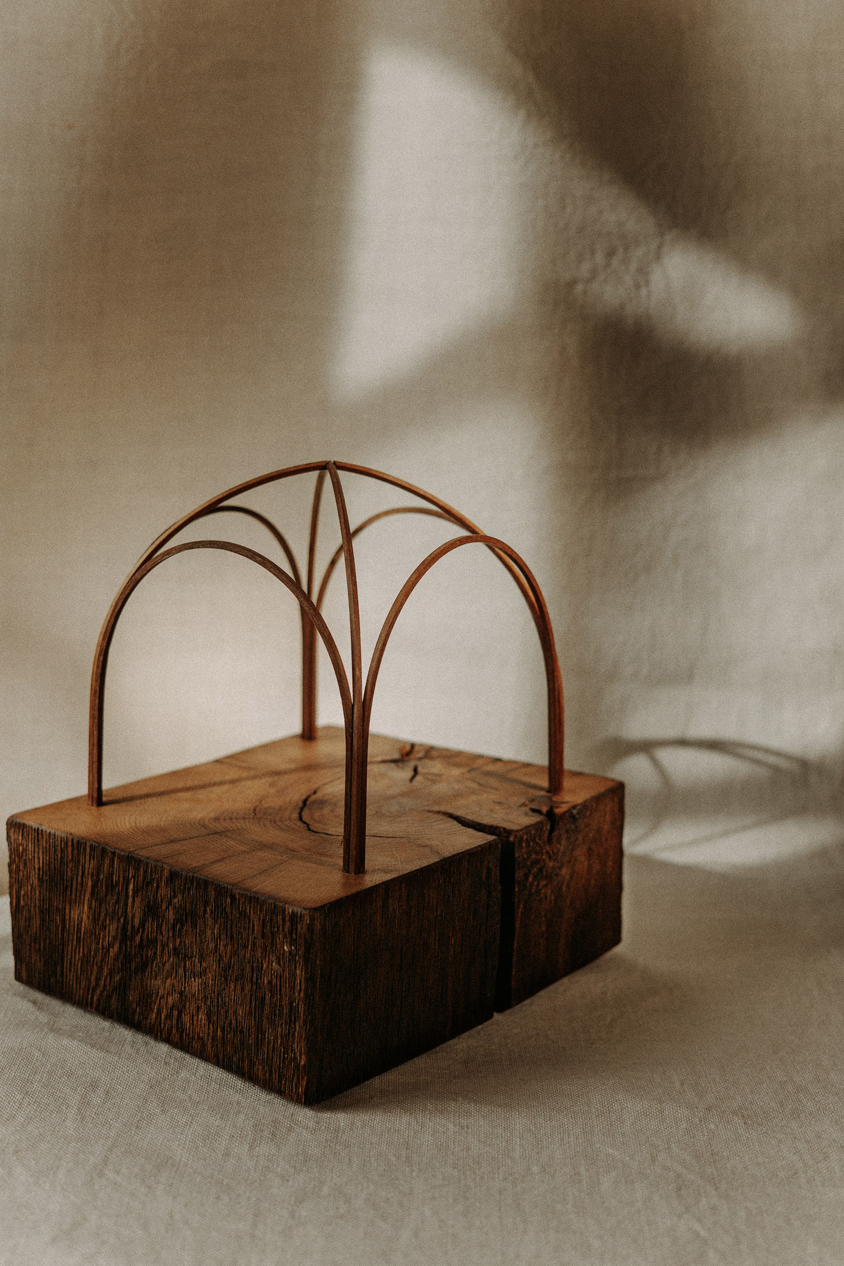 La nef de la cathédrale Saint-Étienne est précurseure du gothique méridional : un style architectural typique à l’Occitanie. Cette sculpture en bois massif lui rend hommage. Les arches en noyer massif sont délicatement cintrés à la vapeur, et se logent avec contraste dans le socle en chêne réalisé à partir d’une authentique poutre de ferme centenaire Lauragaise.