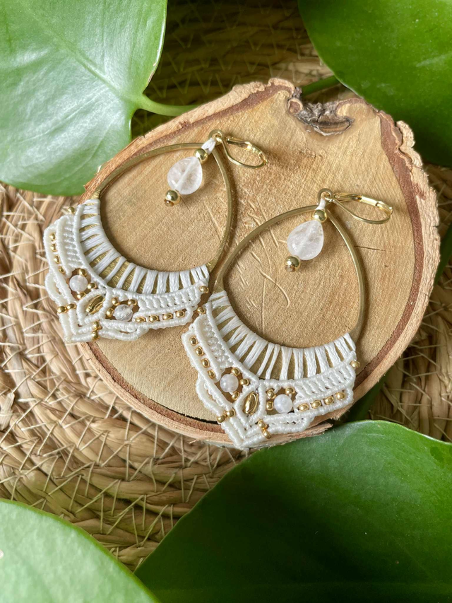 Boucles tissées à la main dans mon atelier du sud de la France avec la technique du micro macramé. Le fil utilisé est in fil plat de 0,8mm blanc apposé sur des structures en laiton doré . Les pierres utilisées sont en acier inoxydable et des rocailles miyuki dorés . Les pierres naturelles sont en cristal de roche et pierre de lune . Les apprêts sont en acier inoxydable doré , conformes à la norme REACH .