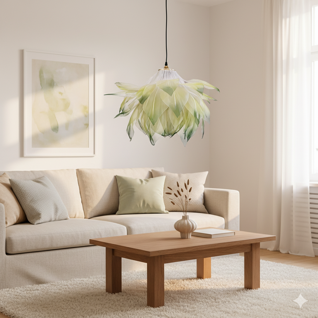 Pièce unique en organza vert, chaque forme est découpée et façonnée à la main pour évoquer une oasis de lumière, à la fois légère et rayonnante.