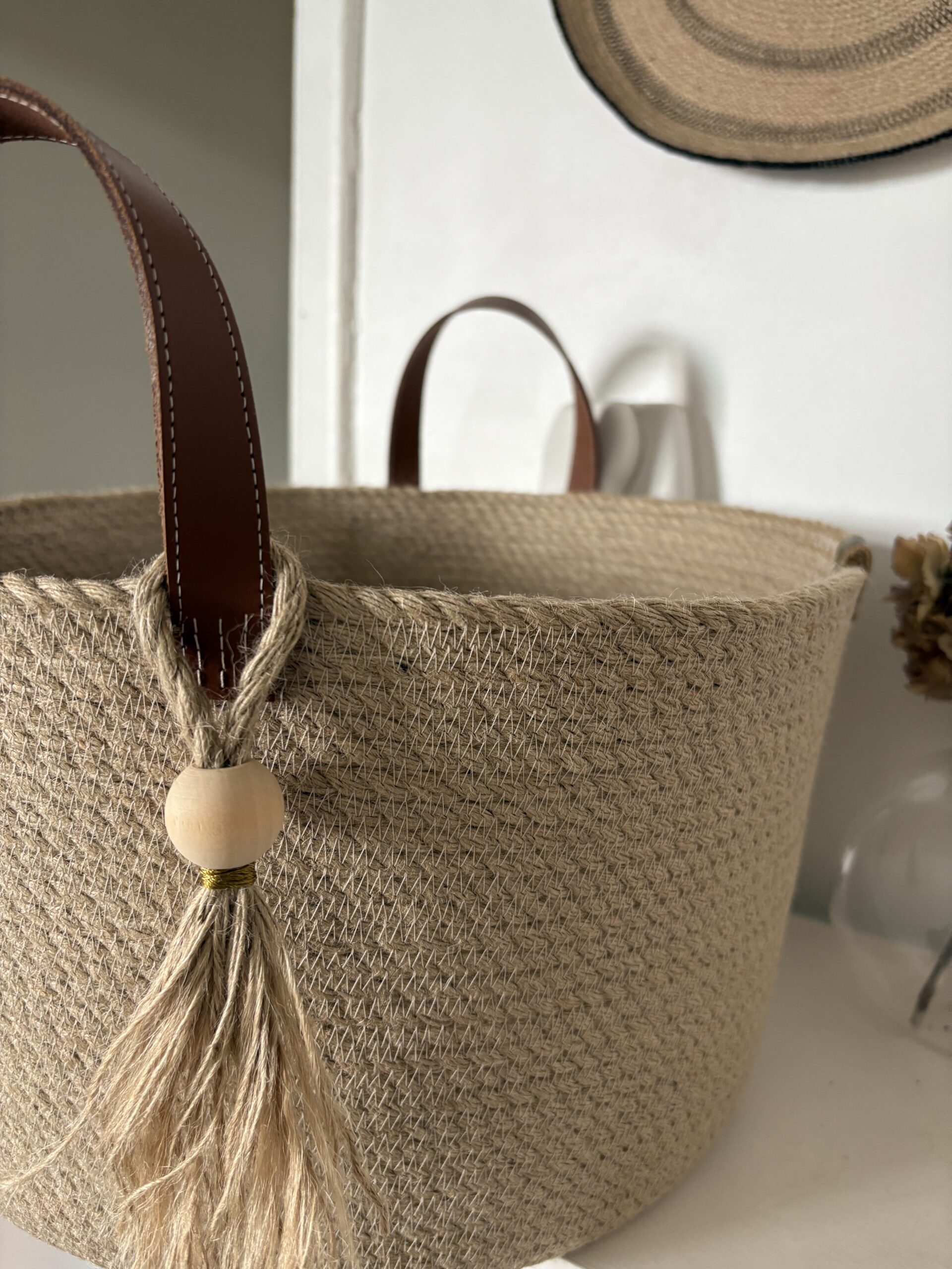 Panier de décoration en tresse de jute – anses décoratives en cuir surpiqué – détail pampille