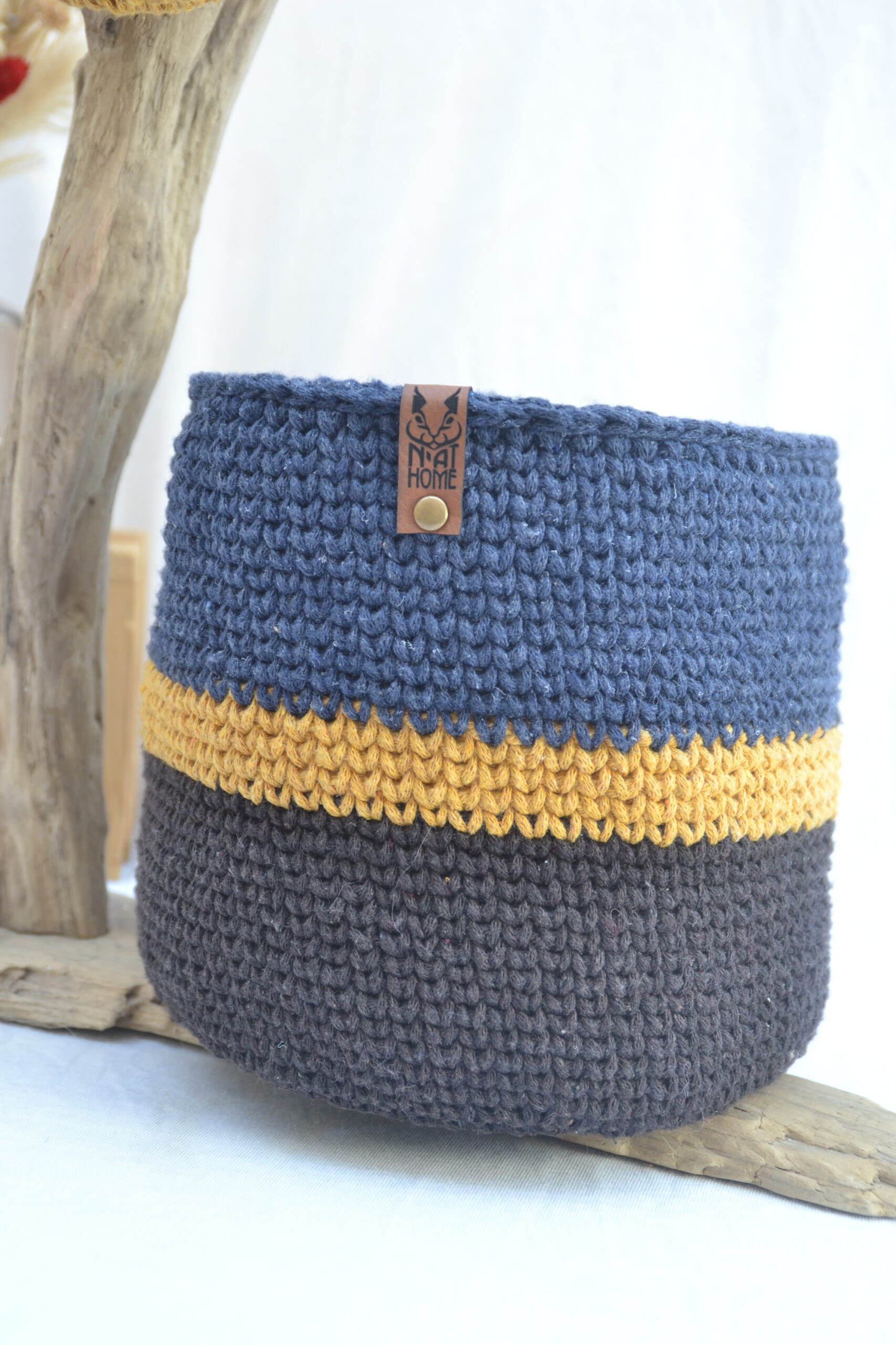 Ce panier a été crocheté à la main avec du coton recyclé Ce panier a de multiples utilisations possibles. Il mesure environ 17 centimètre de diamètre extérieur et 17 centimètre de haut. Il pourra donc aussi être utilisé également comme cache-pot (en mettant une coupelle sous votre plante) si vous êtes un adepte des plantes vertes. Il s’agit ici d’un exemplaire unique.