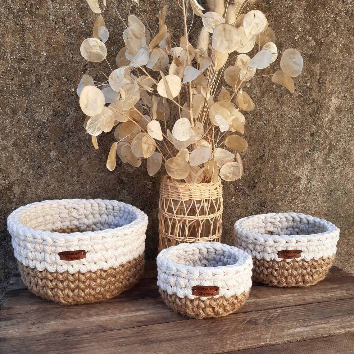 Réalisés au crochet, ces paniers bi-matière combinent la robustesse de la jute avec la douceur du coton. Le mélange des deux fibres leur donne une bonne tenue tout en restant souple au toucher. Parfaits pour accueillir vos petits objets du quotidien ! Disponibles en plusieurs tailles et couleurs, ils s’intègrent harmonieusement dans toutes les pièces de la maison, offrant à la fois fonctionnalité et esthétisme.