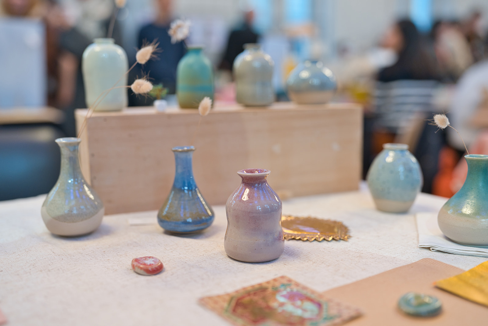 Voici des petits soliflores que j’ai confectionné spécialement pour le marché « Banh Mi Women » qui mettait en lumière des créatrices asio-descendante, qui à eu lieu à la mairie du 13e arrondissement de Paris. Chaque soliflore est différent et unique, il vous faudra choisir celui que vous préférez le plus ! Ils peuvent accueillir de petites fleurs ou non… Description : Grés blanc et émail coloré Taille maximum 11 cm