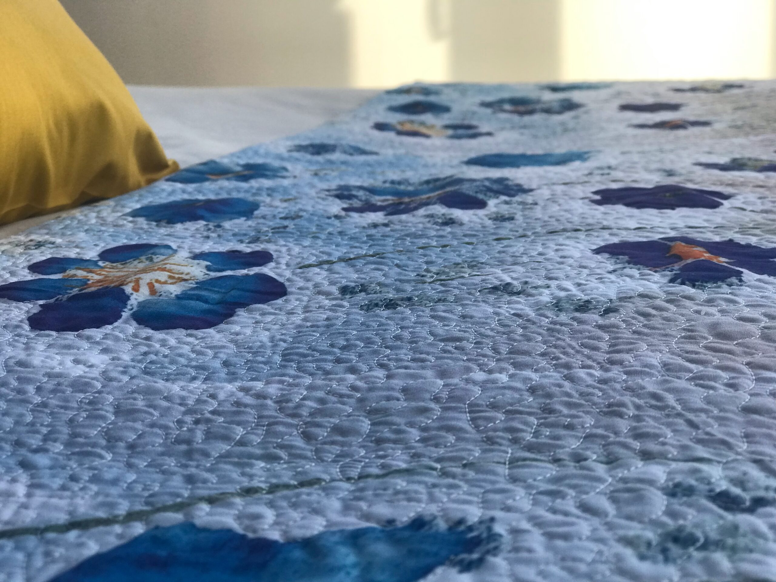 Pièce unique. Motifs exclusifs Colombe et Marguerite. 100% Coton Bio fabriqué en France, dessus coton imprimé exclusif Colombe et Marguerite, design par Edith Llorens, intérieur molleton coton, dessous coton sable uni. Une très belle qualité de coton en couleurs, dans les tons de bleu, or, sable, sur fond blanc ciel et sable. Un pied de lit fabriqué dans mon atelier en Occitanie, matelassé en quilting intuitif, avec des formes de coeurs/trefles. Le matelassage est réalisé sur cadre avec une machine à Quilter « Long Arm » (à bras long) Les coussins présentés, aux couleurs coordonnés peuvent être réalisés sur demande, vendus séparément et non matelassés. Il est aussi possible de commander un imprimé ou un uni, matelassé ou non, et vendus séparément. Dimensions du pied de lit : 180cm x 41cm (contactez-moi pour d’autres dimensions, sur commande) Entretien : lavage machine à 40° – Séchage machine à délicat – Repassage même à vapeur