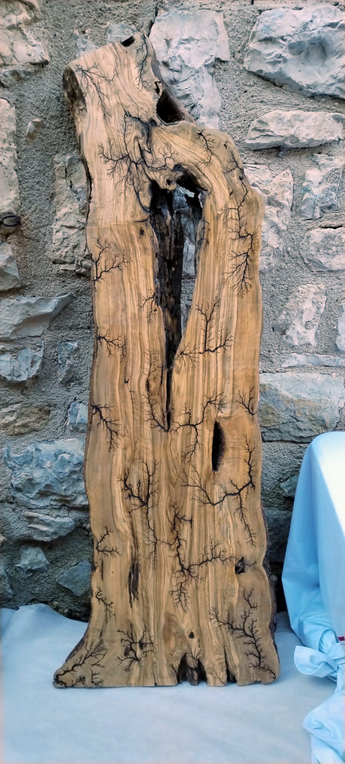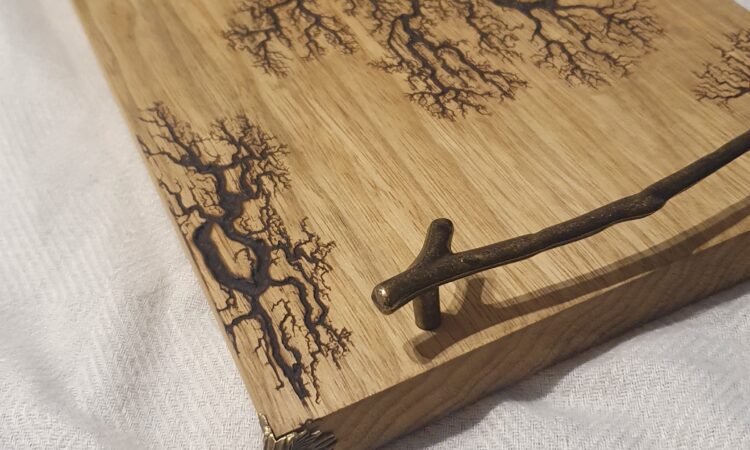 Morceau d’une tranche d’olivier de L126xl35xepais5 ayant reçu le principe de la foudre. 2000 volts envoyés sur la surface du bois pour créer des motifs appelés fractals