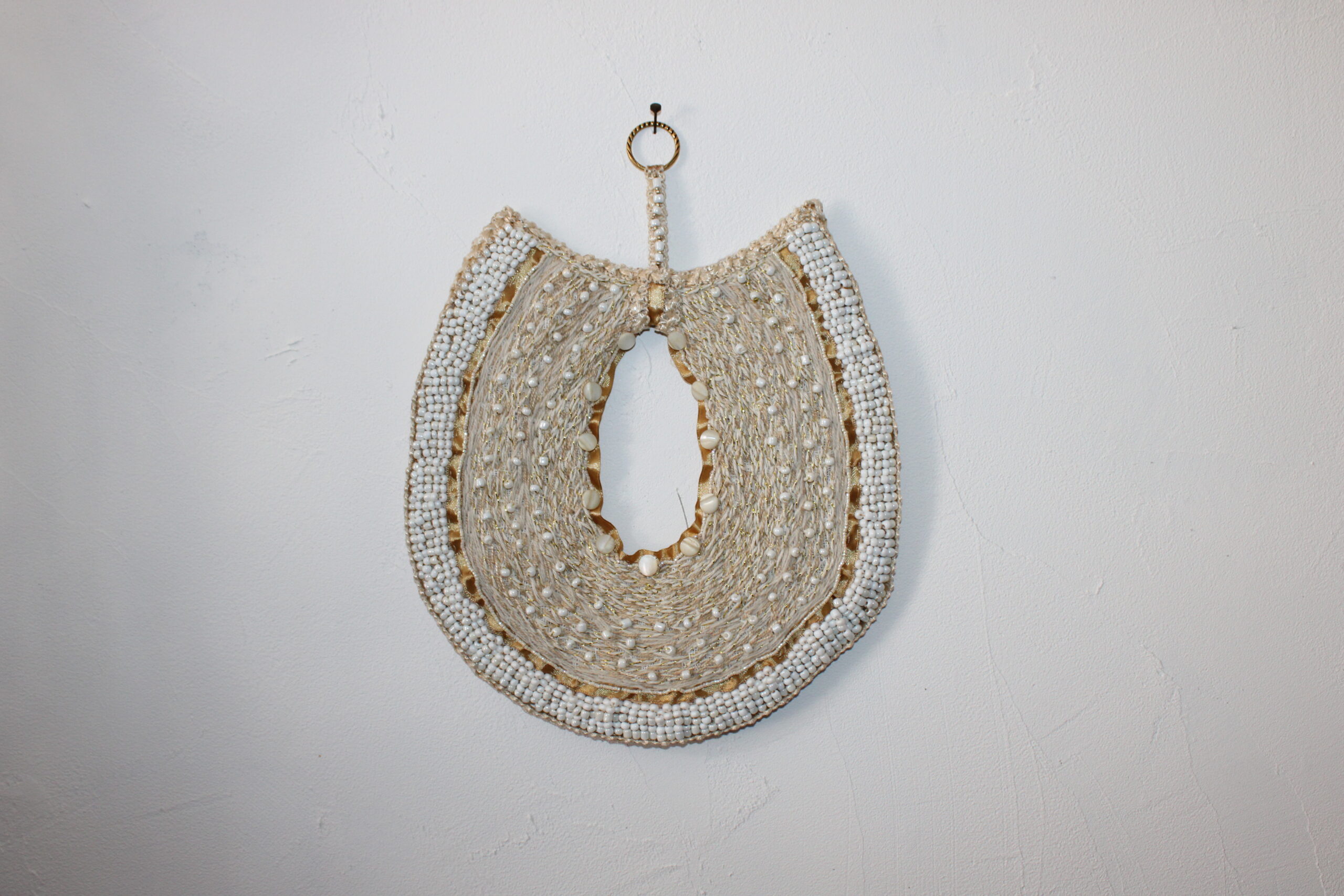 Broderie à la main avec du fil de coton couleur lin, et du ruban de satin doré, Boutons de nacre et perles de rocaille blanc nacré, 22cm large – 28 cm long