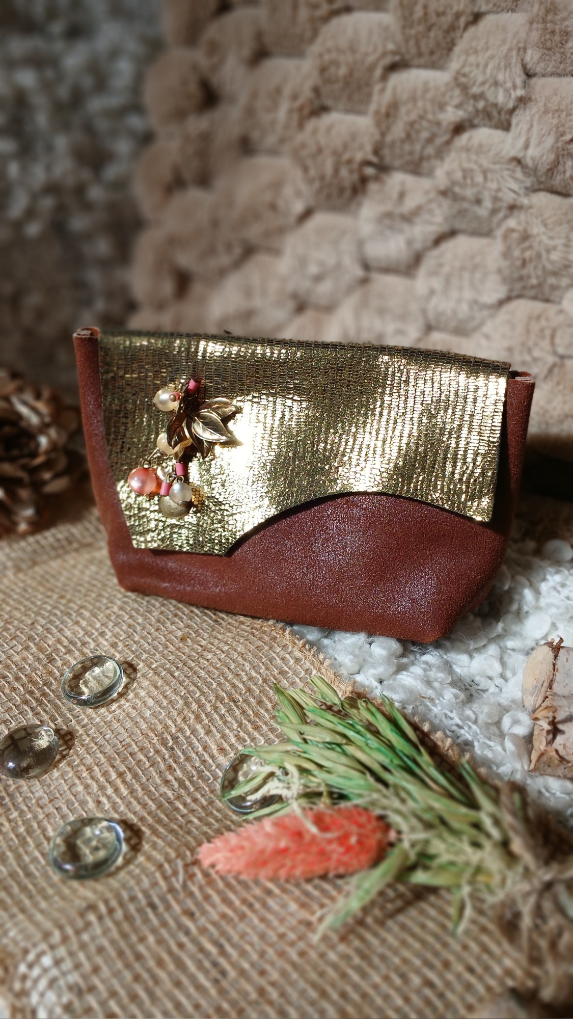 La pochette « Isis » est l’alliance parfaite entre féminité et élégance durable. Conçue dans une démarche éthique, ce petit accessoire associe un cuir surcyclé rouille récupéré d’un sac, à un rabat en cuir doré et texturé. Chaque détail a été pensé pour sublimer sa singularité, comme la boucle d’oreille de seconde main, ornée de feuilles dorées, de perles nacrées et de touches rosées. Idéale pour ranger votre maquillage avec élégance, la pochette « Isis » est une création empreinte d’histoire, de charme et d’écoresponsabilité, une des premières créations d’Occi-Tanne.