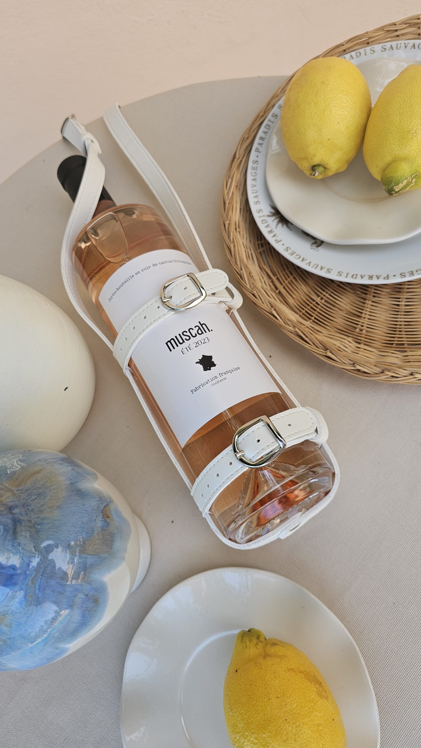 Porte-bouteille à base de cactus Disponible en noir et blanc Fabriqué en France – Occitanie – 2 lanières horizontales réglables grâce à des boucles de ceinture permettant d’attacher plusieurs circonférences de bouteilles entre 22 cm et 28 cm. – 1 anse avec une boucle de ceinture permettant d’ajuster la longueur à la taille de la personne le portant. Cette matière nommée Deserto et plus communément appelée « cuir de cactus » est une nouvelle technologie innovante et durable confectionnée à partir de l’opuntia ficus-indica (figuier de barbarie). Cette matière est réalisée à partir de cactus biologique et produit dans le respect de l’environnement sans aucun produit chimique. Très résistant aux griffures et à l’eau, avec une solidité extrême et une durabilité impressionnante, son toucher doux et ses nombreuses propriétés font de cette matière un redoutable concurrent au cuir animal.