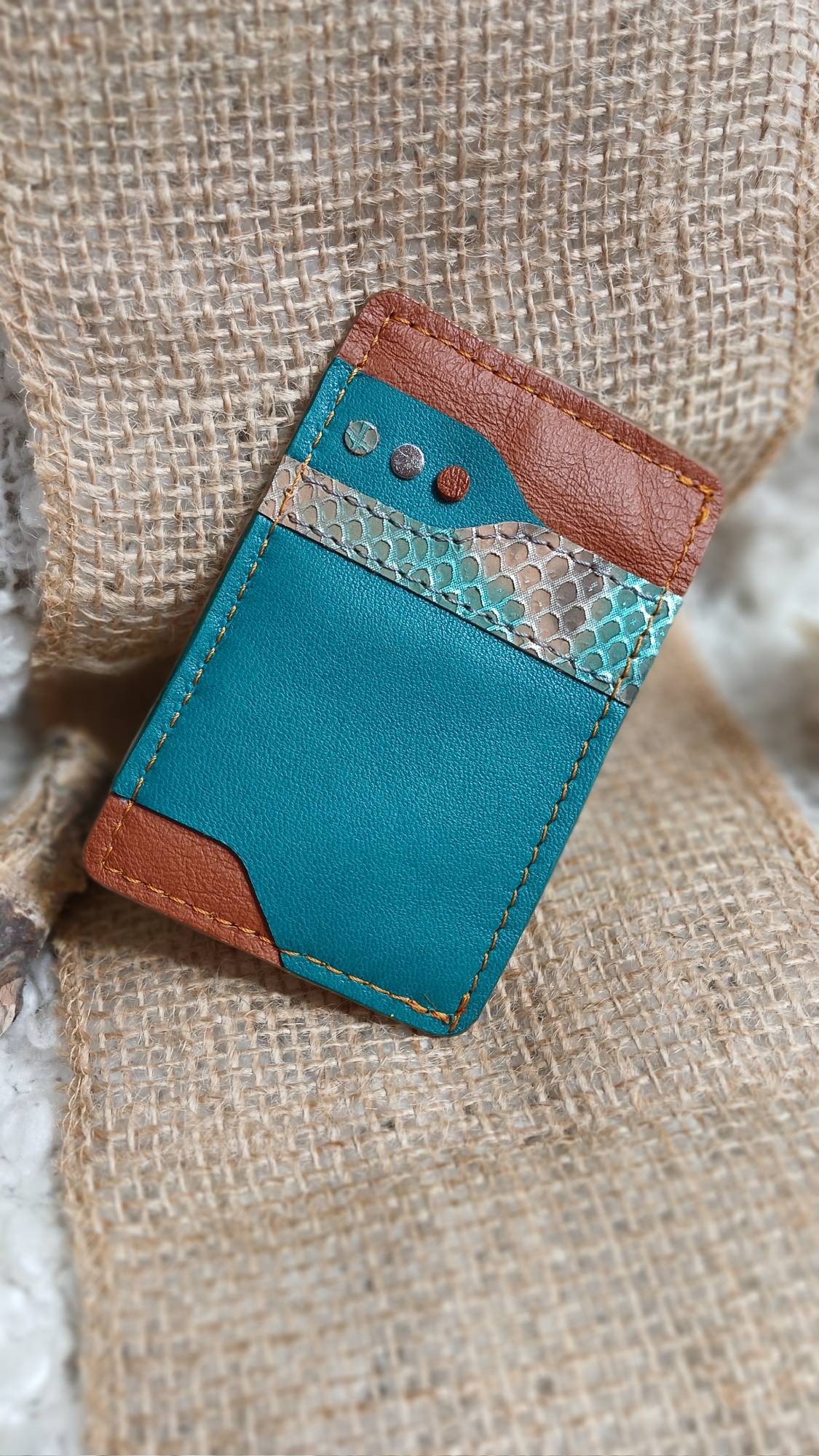 Le porte‑carte « Aquaverdé », en cuir surcyclé turquoise et marron, est un petit accessoire très pratique composé de 3 compartiments. Sa poche centrale, située au cœur du porte‑carte, permet de glisser cartes et billets. Sur les faces extérieures, deux compartiments offrent un accès facilité à vos cartes. Leur découpe en forme de vague assure une prise en main immédiate. Le cuir fantaisie texturé, légèrement brillant, renvoie des reflets irisés dans les tons beige, gris et turquoise. Trois petites pastilles reprennent elles aussi les couleurs des cuirs principaux, pour une touche finale féminine et subtile. Pensez à le coordonner avec les autres créations de la catégorie Les « Complices Aquaverdé ».