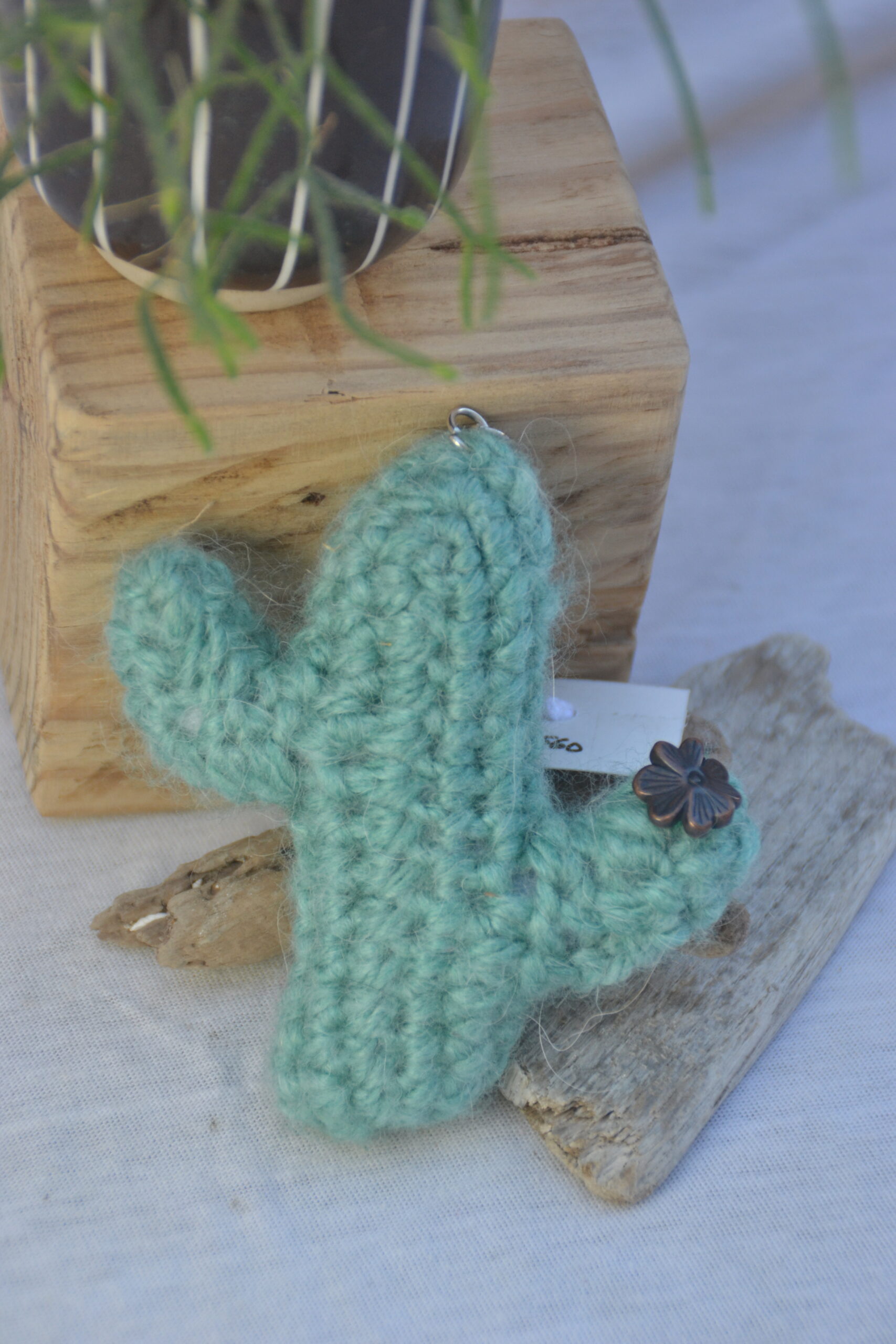 Ce Cactus a été crocheté à la main, la petite fleur en métal a été cousue dessous et l’ensemble a été monté en porte clé. Il peut être utilisé comme porte-clé, forcément, mais comme il est assez grand il pourra également être utilisé comme bijou de sac en l’accrochant à une fermeture éclair par exemple. Il s’agit d’un exemplaire unique, fait main. Il mesure environ 9cm de haut et aussi de large avec les 2 « bras ».