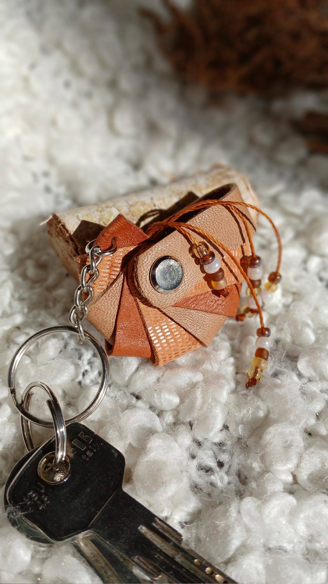 Laissez-vous séduire par le porte-clés « Arcade », une création raffinée en cuir upcyclé qui apportera une touche d’élégance et de féminité à vos objets quotidiens. Sa forme inspirée du nautile symbolise l’harmonie et l’authenticité, tandis que l’association des cuirs en dégradé, lui confère une douceur à la fois subtile et sophistiquée. Les cuirs beige, marron clair et orange texturé subliment cette pièce unique. Un fil ciré, s’épanouissant délicatement à partir du nautile, se termine par de petites perles assorties, ajoutant fluidité et charme à ce design original. Associez le porte-clés « Arcade » à d’autres créations de la catégorie Les Complices « Arcade » pour harmoniser votre univers et prolonger l’élégance de ce style unique.