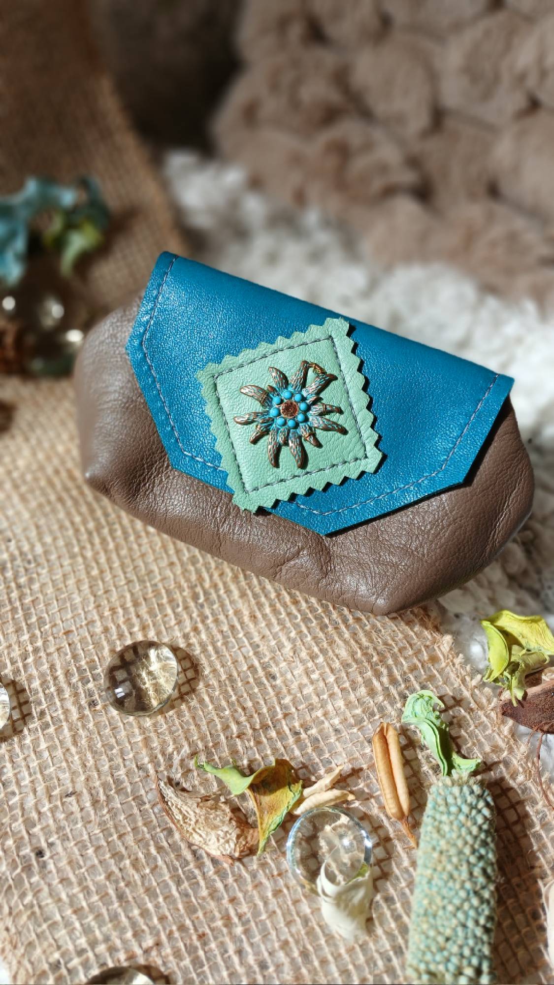 Le porte-monnaie Aquaverdé en cuir surcyclé est un accessoire féminin élégant, conçu pour vous suivre au quotidien avec style et praticité. Sa partie principale, en cuir surcyclé taupe; Le rabat, en cuir turquoise, est rehaussé d’un petit morceau de cuir vert pâle et d’un bijou bronze et bleu que j’ai cousu à la main : cette touche upcyclée est la signature Occi-Tanne. Pratique et ingénieux, le rabat sert également de poche intérieure pour accueillir votre carte ou quelques billets. Compact et raffiné, le porte-monnaie Aquaverdé se glisse facilement dans un sac ou se porte seul comme accessoire de style. Je l’ai imaginé pour allier féminité, praticité et engagement écoresponsable, afin de créer une pièce unique qui dure et séduit. Associez-le aux autres créations de la catégorie « Complice Aquaverdé » pour composer un univers harmonieux et prolonger l’élégance de ce style unique, où artisanat et éthique se rencontrent.