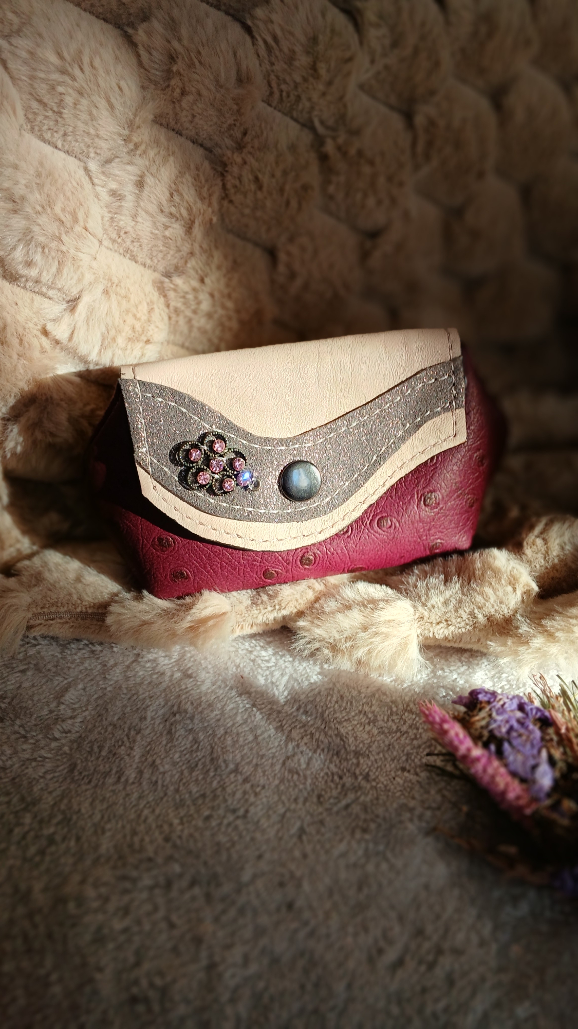 Ce porte‑monnaie « Poudré » en cuir surcyclé a tout d’un grand. Compact mais élégant, il associe un cuir bordeaux profond pour sa partie principale, un rabat beige rosé empreint de douceur, et une touche d’argent pailleté qui capte et reflète subtilement la lumière. Le détail qui fait toute la différence ? Une boucle d’oreille de seconde main, délicatement réinventée et cousue à la main. Avec ses tons bronze sublimés par des strass rosés, elle apporte une finition bijou unique qui attire tous les regards. Petit mais ingénieux, ce porte‑monnaie est pensé pour être aussi fonctionnel qu’esthétique. Il accueille votre monnaie et vos billets, tandis que son rabat a été astucieusement conçu pour y glisser une carte bancaire. Un véritable deux‑en‑un upcyclé qui assure que vos essentiels restent toujours à portée de main. Associez‑le à d’autres créations de la catégorie Les Complices « Poudré » pour harmoniser votre univers et prolonger l’élégance de ce style unique.