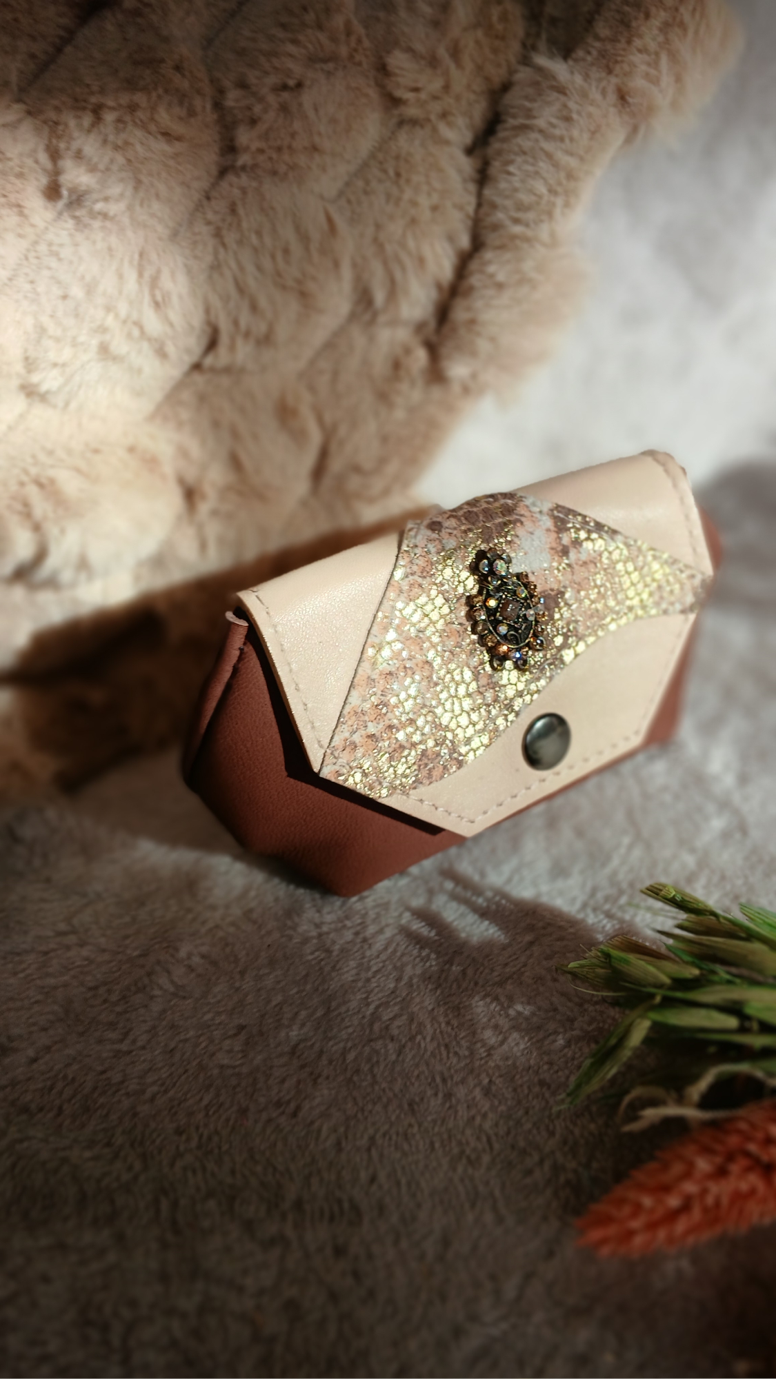 Le porte‑monnaie « Roséa » en cuir surcyclé associe féminité et raffinement. Avec son cuir marron, son rabat effet peau de serpent et son bijou en boucle d’oreille revalorisée, il est l’accessoire idéal pour un style unique et écoresponsable. Plus de description via le lien
