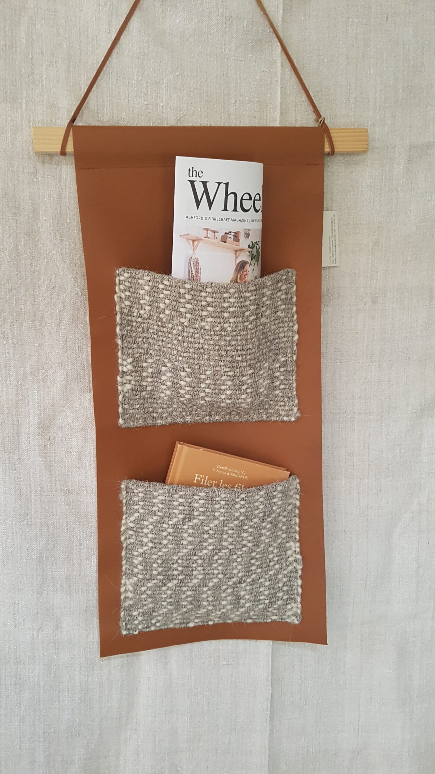 Cette pièce unique est née d’une collaboration artisanale entre mon atelier de tissage et la maroquinerie toulousaine Méta. Nous avons imaginé une alliance de matières : un cuir couleur havane aux lignes épurées pour rencontrer la chaleur de la laine brute des Pyrénées. Les deux pochettes sont tissées à la main sur mon métier de table pour un fini texturé et authentique. Chaque élément est cousu sur cuir, monté sur une structure en bois et maintenu par un lien en cuir. Le tout mesure 29 x 64 cm, hors suspension.