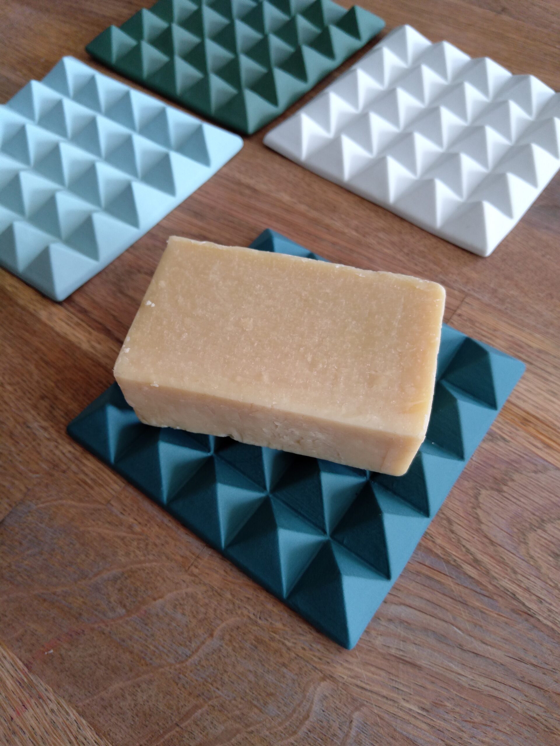 C’est un porte savon en porcelaine. C’est la répétition de 25 pyramides assemblées pour former un carré de 10 cm de côté, en biscuit de porcelaine colorée.