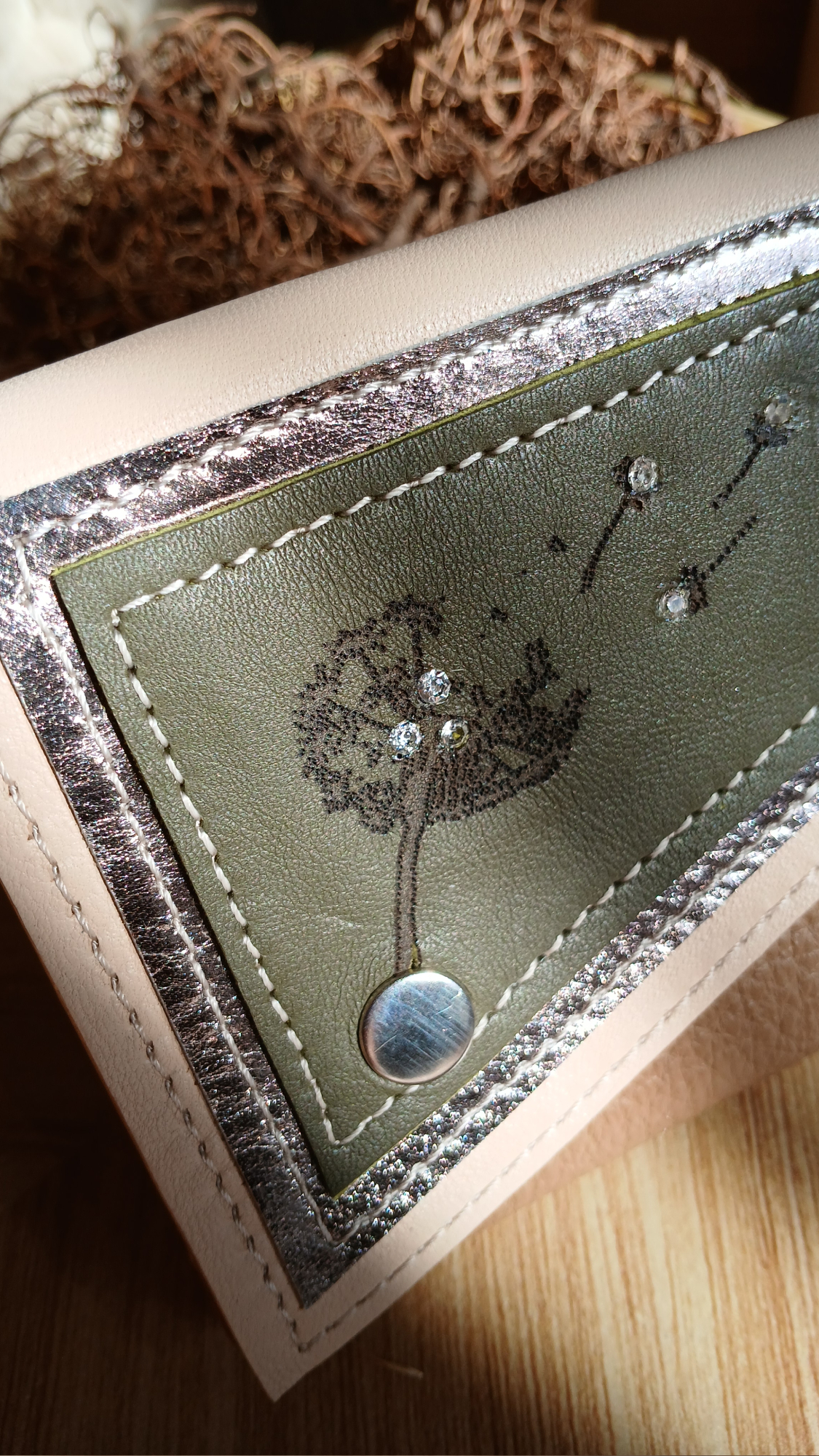 Laissez-vous charmer par le portefeuille « Boisdoré », une création en cuir surcyclé alliant praticité, féminité et engagement écoresponsable. Compact et fonctionnel, il accueillera vos essentiels du quotidien avec élégance. La partie principale se distingue par sa teinte chaleureuse et intemporelle. Le rabat, délicatement cousu à la main, associe des cuirs beige rosé, argenté et kaki. Un motif floral pyrogravé, déjà présent sur la chute de cuir, a été sublimé par l’incrustation minutieuse à la main, de strass issus d’un collier de seconde main. Ces détails uniques apportent une touche féminine et affirmée, signature distinctive de l’univers Occi-Tanne. Les soufflets du portefeuille, réalisés en deux couleurs différentes ajoutent une dimension graphique et harmonieuse à l’ensemble. Associez-le aux autres créations de la collection Les Complices « Boisdoré » pour un ensemble harmonieux qui reflète votre style et prolonge l’élégance de cette ligne d’exception.