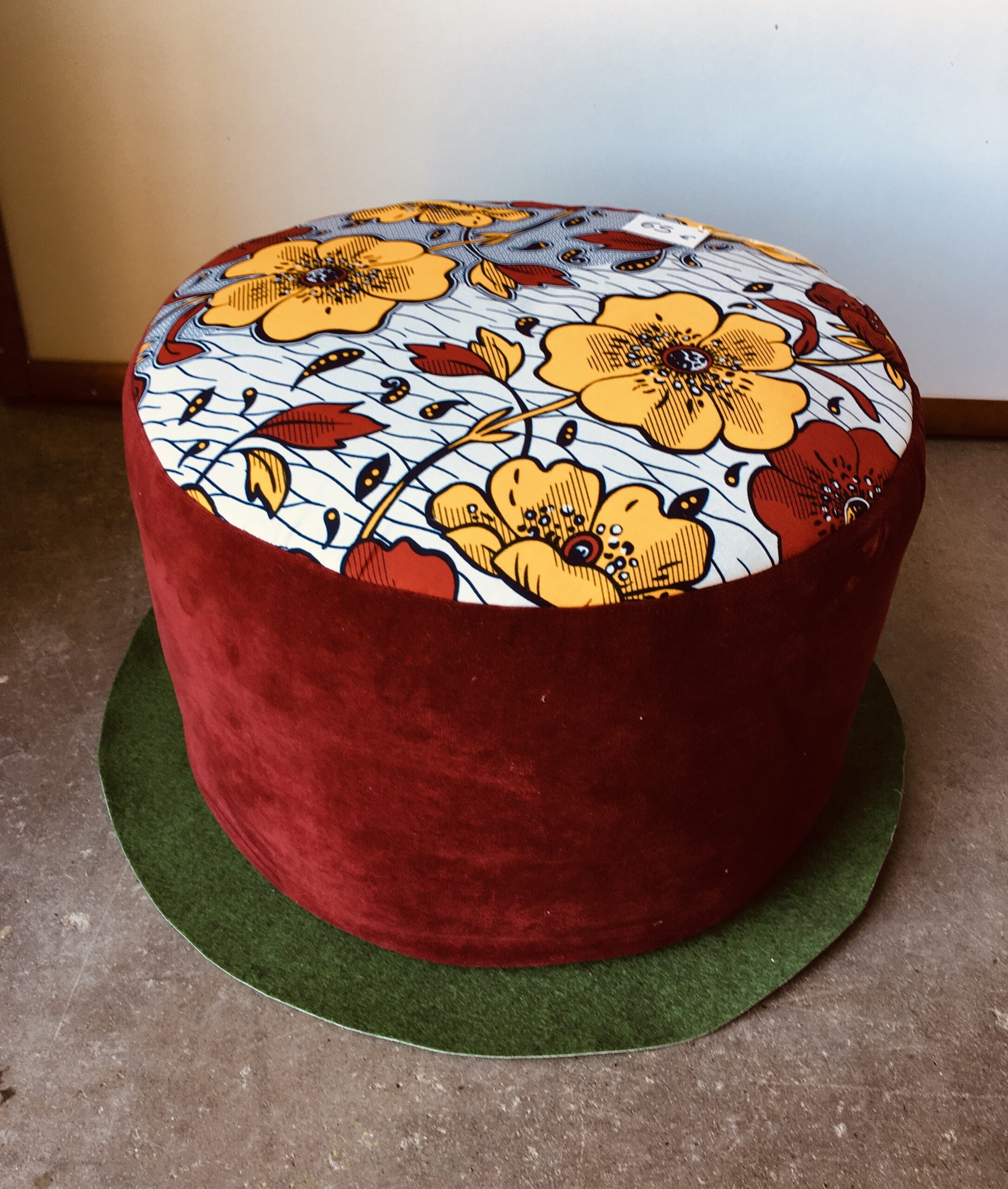 Pouf fabriqué à partir de matières recyclées, feutre de sol pour la doublure, raphia pour le rembourrage et velours de théâtre pour l’enveloppe extérieure.