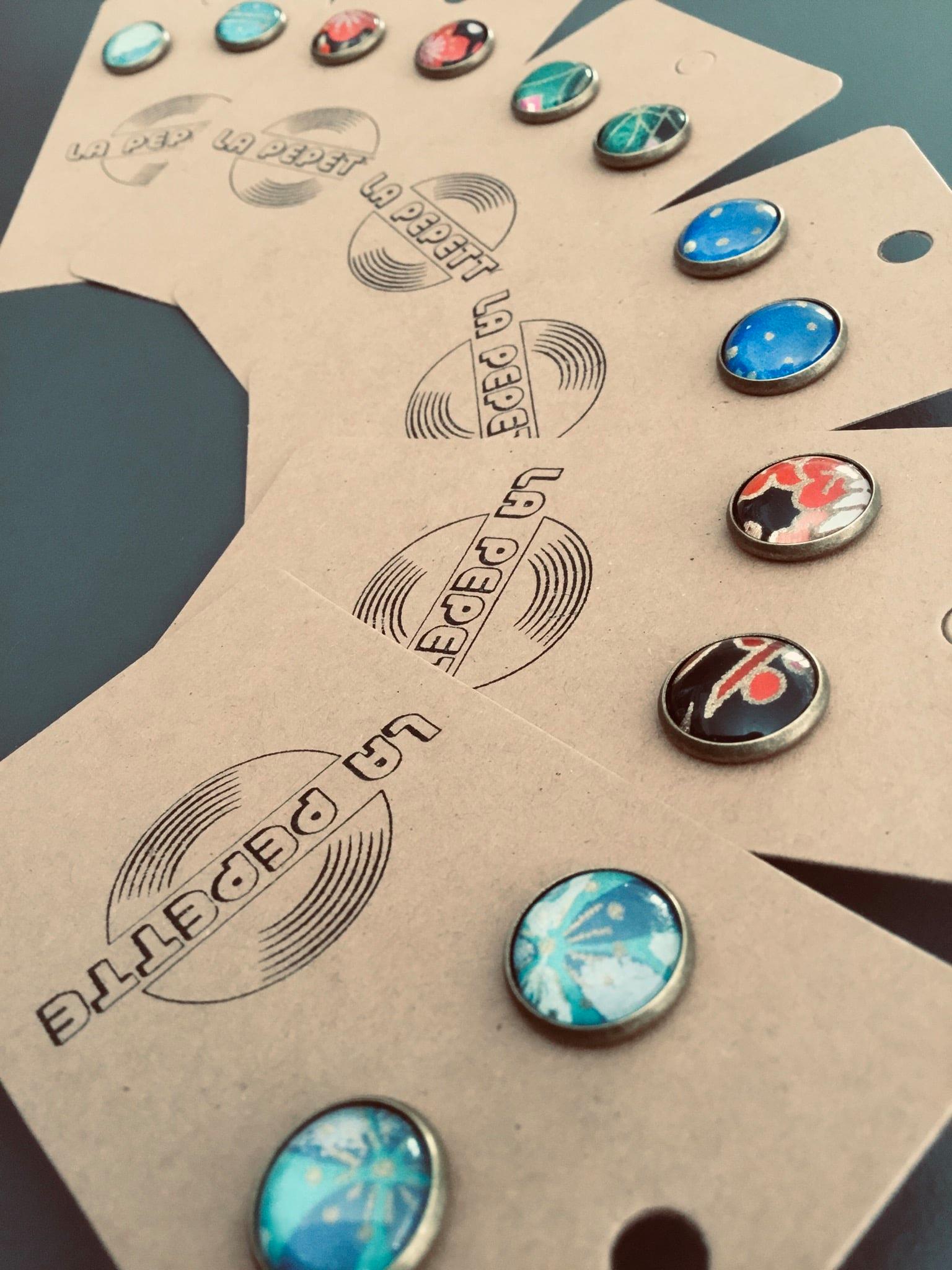 Puces en laiton, washi et cabochon en verre.