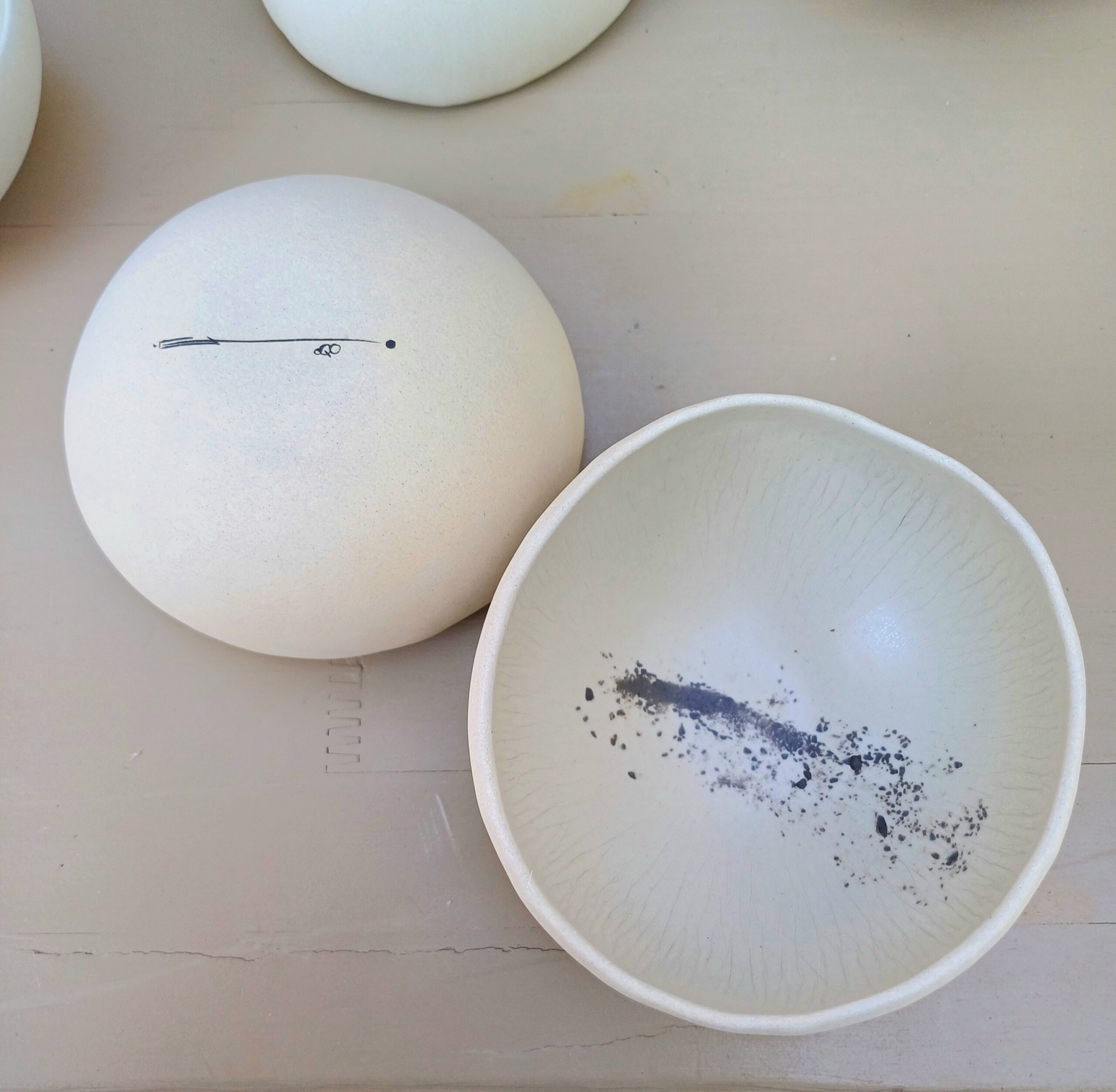 ··· céramiques douces et élégantes ··· oQO c’est rond, c’est court, ça percute aussi, et c’est graphique. Une signature stylisée, au pinceau, pensée pour être reconnaissable. Une identité forte, des formes douces, une attention portée à l’aspect de matière. Je réalise des objets céramiques d’art de la table et de décoration intérieure ··· Ma démarche : minimalisme et sensualité. Minimalisme dans la neutralité des tons, les formes dépouillées, le peu de matières utilisées, le peu de matériel nécessaire, créer avec peu, avec moins. Sensualité dans la prise en main réconfortante, caressante, penser des objets que je souhaite élégants au regard et au toucher ··· J’interroge à chaque étape le geste, afin de limiter les énergies consommées : façonnage à la plaque sans croûteuse et modelage / créer en utilisant uniquement deux grès et un émail / mono-cuisson 1260°C réductrice dans four gaz auto-construit / valoriser les chutes de découpe, les débris d’accident de cuisson.