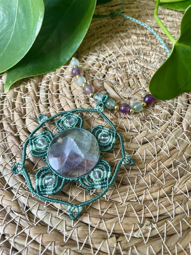 Collier tissé à la main , dans mon atelier du sud de la France avec la technique du micro macramé . Les pierres qui composent ce collier sont des fluorites multicolores. Le fil utilisé est un fil plat de 0,8 mm vert émeraude et vert pâle , réputé pour sa grande solidité il garantira longue vie à votre bijou. Dans le tissage , on retrouve des perles miyuki dorées duracoat et sur le cordon des perles en acier inoxydable entre chaque pierre de fluorite. La longueur du collier est ajustable grâce à sa fermeture coulissante tissée , lui permettant de s’adapter à toutes les morphologies. Dimensions : Longueur totale : 114cms , Hauteur : 7,5 cms , Poids : 28 g