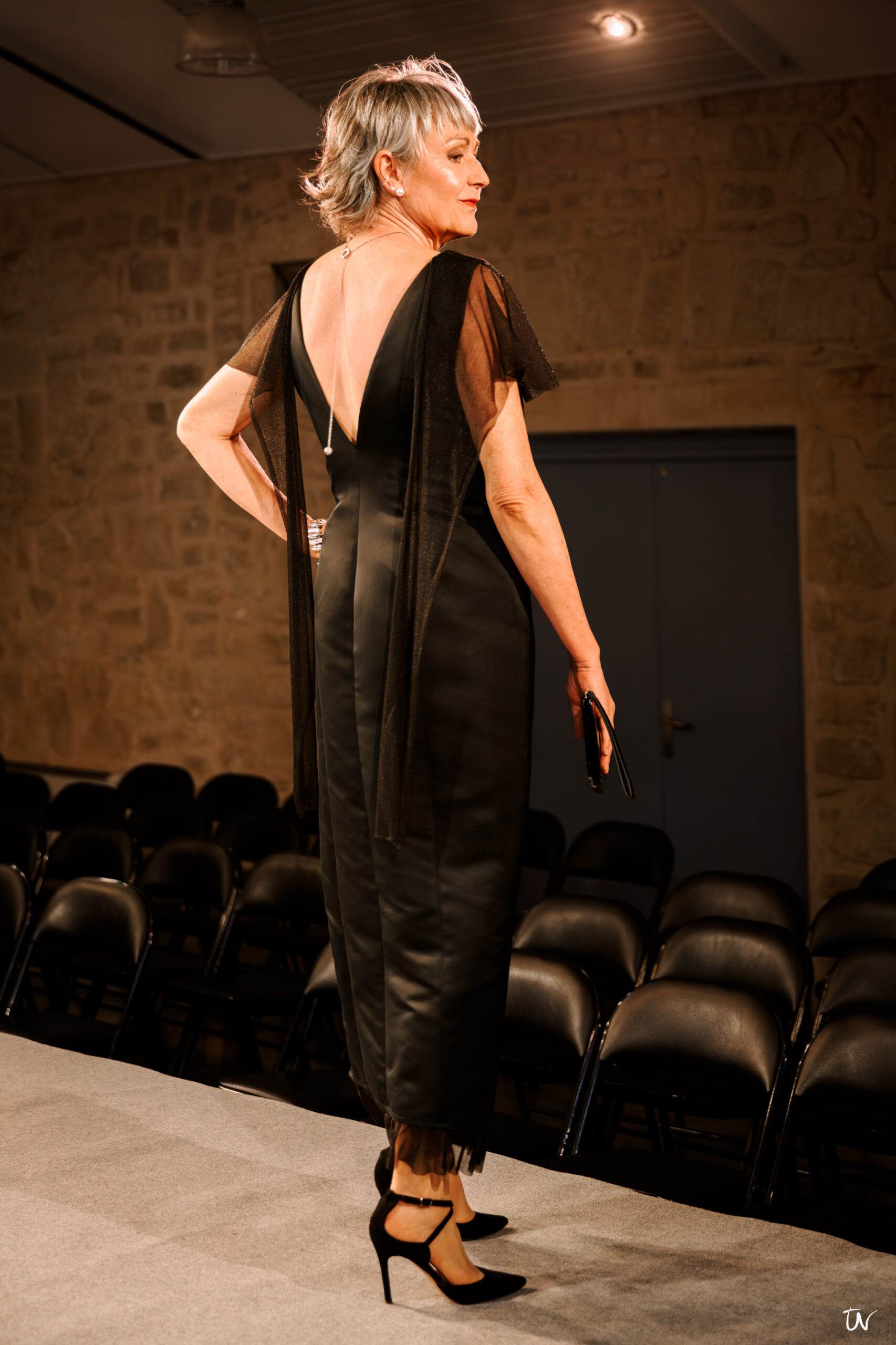 Robe de soirée en satin duchesse ébène. Décolleté dos. Etoffe haute couture Etole et volant de bas de robe en résille noire irisée
