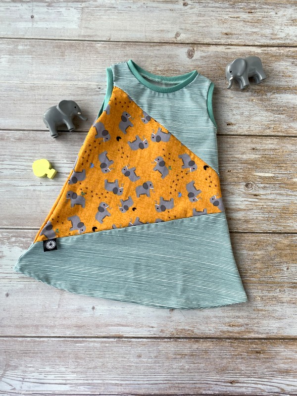 Petite robe pour bébé et enfant de 3 mois à 4 ans en jersey de coton souple et confortable. De jolies découpes sur le devant et le dos. Robe sans manches. Emmanchures et encolure terminées pas un bord côte replié. Robe à enfiler.