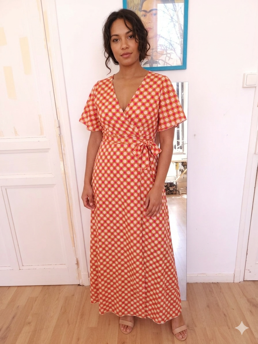 Robe cache-coeur en pur coton, ceinture tres longue, ajustable à votre convenance Manches papillon larges et aérées. encolure en V, qui met en valeur la silhouette. taille S, pièce unique. longueur jusqu’au sol. Pour de belles soirées estivales ou des ballades entre ami.e.s ou un mariage. possibilités de commande sur mesure, avec choix du tissu. (coton, viscose, lin…)