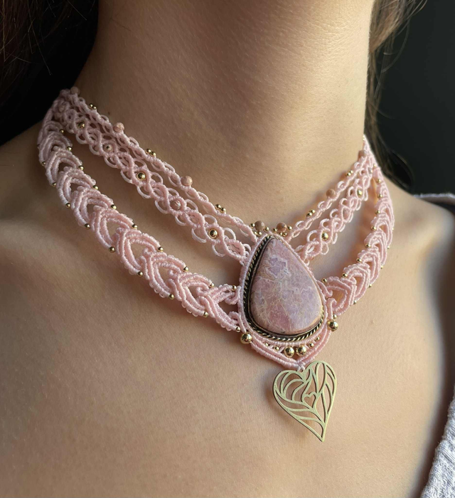 Pièce unique tissée à la main en France avec la technique du micro-macramé , le fil utilisé est un fil plat rose pâle de 0,8 mm réputé pour sa grande solidité , il assurera longue vie à votre bijou. La pierre principale est une Rhodochrosite sertie de laiton , des perles de rhodochrosite facettée de 4mm sont intégrées dans le tissage , les perles de finitions sont en acier inoxydable dorées. La breloque « cœur » est en acier inoxydable doré. La longueur de ce collier est ajustable grâce à sa fermeture coulissante tissée lui permettant d’être adapté à toutes les morphologies. Dimensions : Longueur totale : 96 cms , Largeur du tissage : 17 cms (au plus large), Hauteur totale : 7 cms , Poids : 23 g.