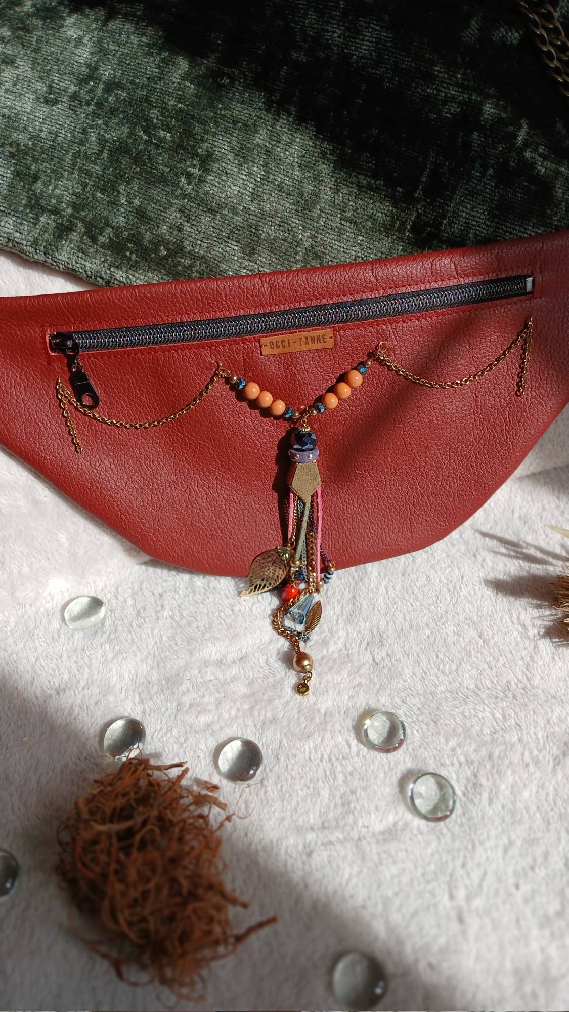 La banane « Ethnica » est un accessoire féminin en cuir upcyclé rouge brique, rehaussé par une fermeture noire qui souligne son intensité. Son bijou de seconde main raconte son vécu : perles orange et noires se mêlent à un pendentif orné de pampilles multicolores aux formes variées. Ce détail unique apporte une dimension artisanale, légèrement ethnique mais toujours subtile, qui fait de ce sac une création aussi chaleureuse qu’affirmée. Sa chaîne métallique bronze accentue son caractère et offre une double manière de le porter, en ceinture ou en bandoulière. Plus qu’un simple sac, la banane « Ethnica » devient une pièce de style, un manifeste d’identité à la fois pratique, éthique et féminin.