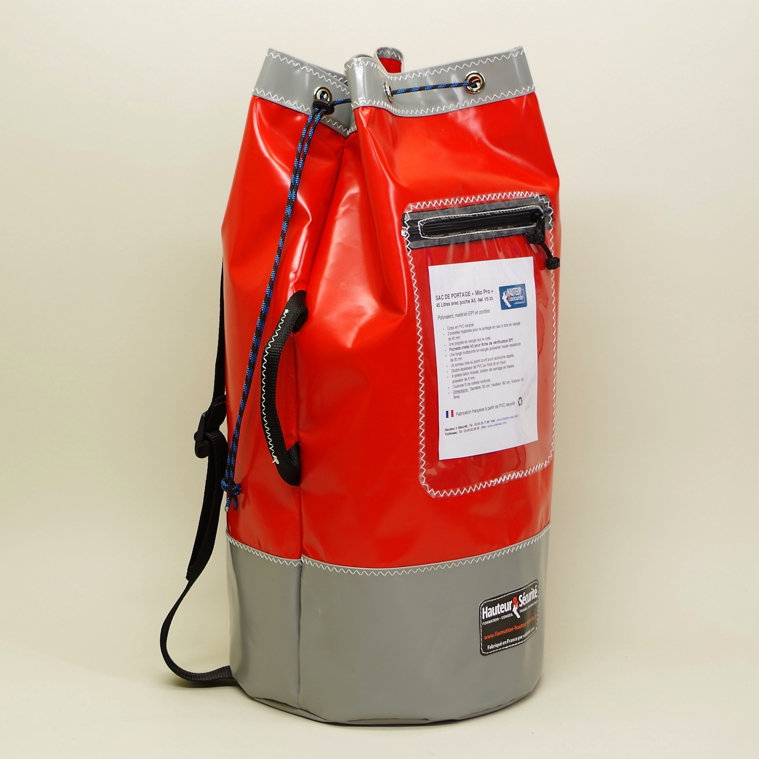 Sac en PVC pour E.P.I. 45 litres avec pochette transparente Zippée, Deux brettelles réglables, longe 3 points avec anneau inox, Poignée sur le coté, cordon de serrage, Double épaisseur de PVC sur le fond et le haut, Diamètre: 30 cm, Hauteur: 60 cm.