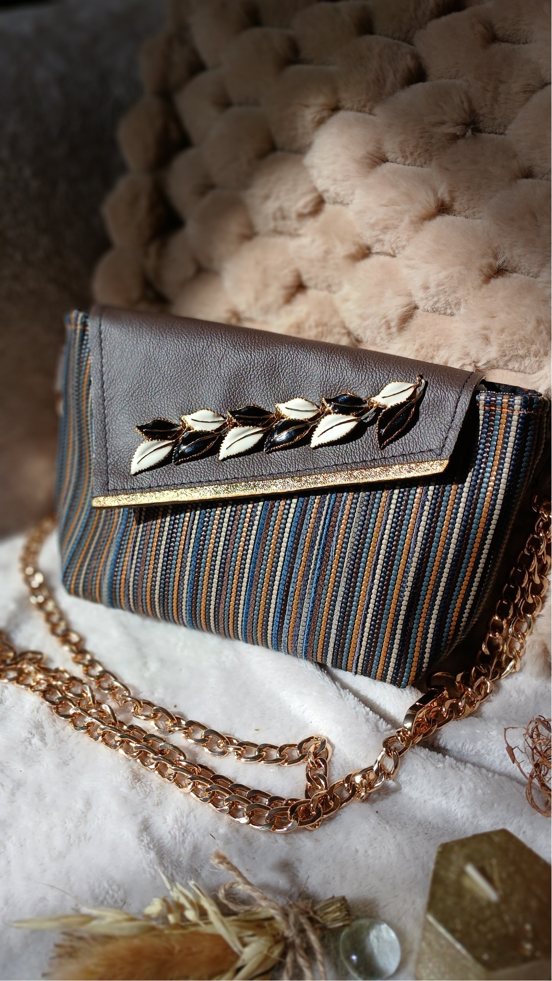 Le sac « Entrelacs » incarne la rencontre parfaite entre sophistication et éthique. Sa partie principale, en cuir upcyclé tissé, lui confère une texture unique et une allure féminine et raffinée. Le rabat, cousu à la main sur le sac, arbore des couleurs brun foncé et doré. Le bijou, qui provient d’un collier, représente des feuilles noires et blanches. Des touches de doré ajoutent une dimension délicate et artistique à ce sac déjà unique. Fixé à la main par des anneaux, il est le témoin d’une réalisation minutieuse. L’intérieur du sac est doublé d’un tissu noir à fines rayures blanches. Récupéré d’une seconde main, la doublure possède deux poches pratiques pour organiser vos affaires. Le sac « Entrelacs » est un exemple parfait de mode durable, sans compromis sur la qualité ni l’esthétique. Sa forme élégante et son design soigné en font un compagnon idéal pour celles qui souhaitent allier raffinement et engagement écologique.