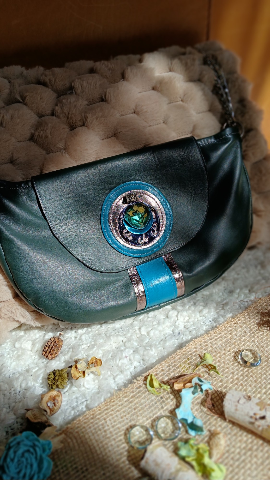 Le sac « Lotus » en cuir surcyclé vert bouteille lisse et très souple, est rehaussée d’un rabat. Cousu à la main sur la base du sac, ses couleurs bleues, turquoises et argentées viennent sublimer le design. Le bijou dans les mêmes teintes, allie des accents argentés et des touches florales jaunes. À l’intérieur, une doublure en T‑shirt de seconde main reflète l’engagement éthique de cette création. La fermeture éclair, de seconde main, est également bleue turquoise. Elle ajoute une touche de couleur supplémentaire et harmonisée, tout en apportant confort et sécurité. Le sac « Lotus » une pièce qui se veut à la fois chic et pratique, pour celles qui apprécient les accessoires qui allient esthétique et engagement durable. Ce sac, à la fois raffiné et audacieux, est une véritable invitation à adopter un style responsable et unique.