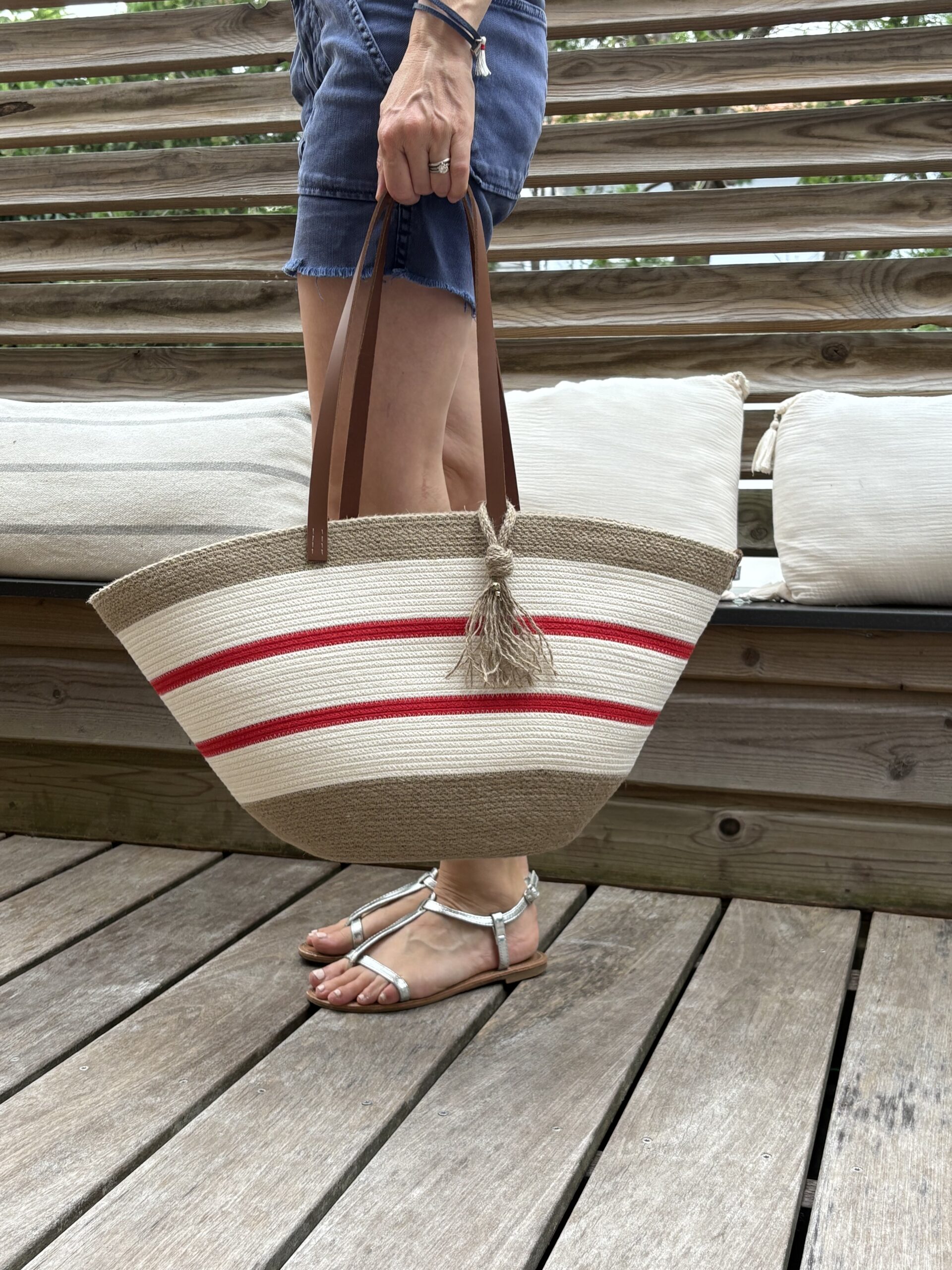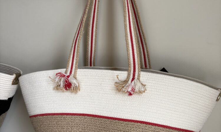 sac panier rayé en tresse de jute et ganses de coton écru et rouge basque