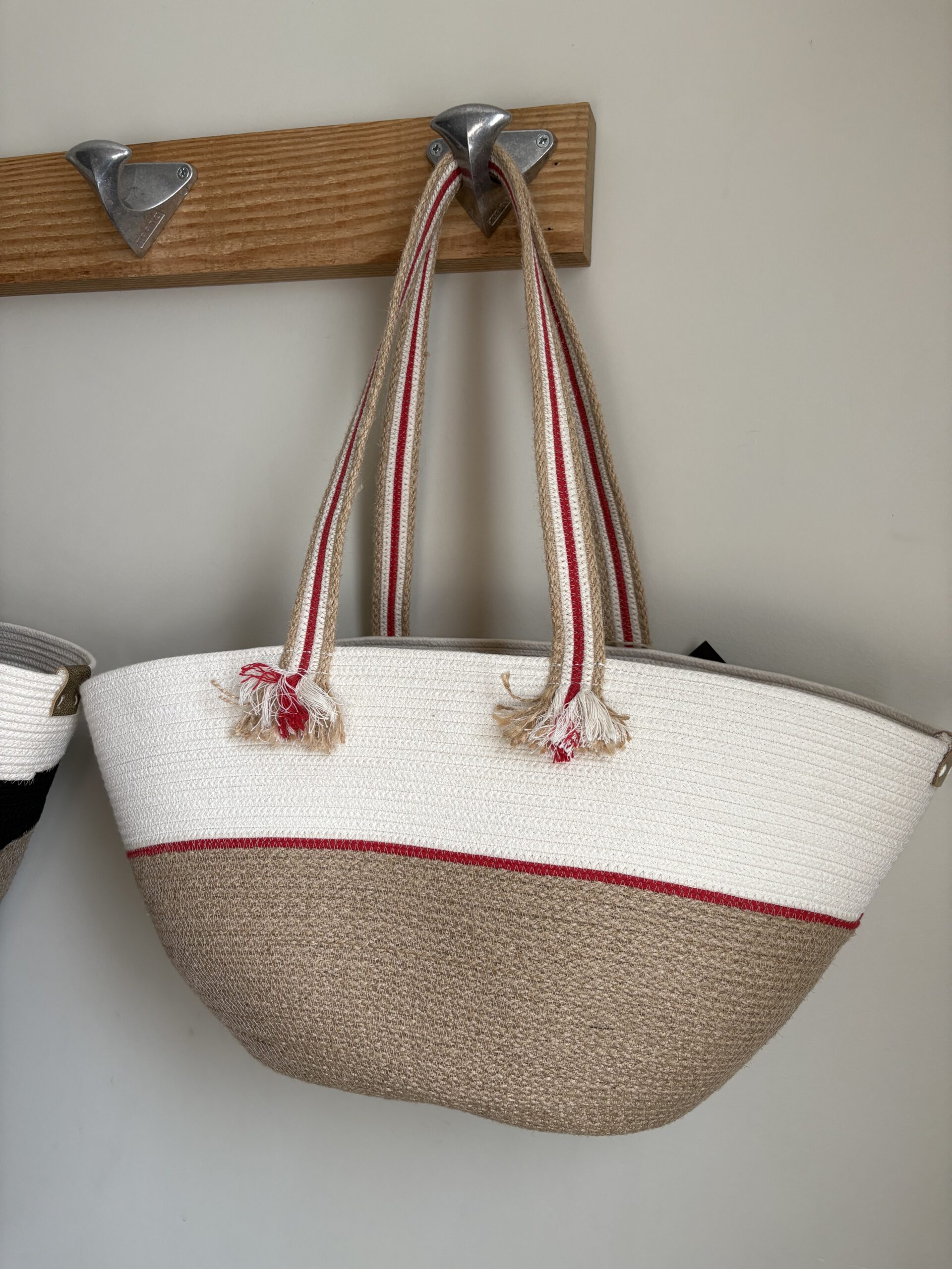 Sac panier en tresse de jute et ganse de coton écru et rouge basque d’origine France – Anses tressées identiques au panier