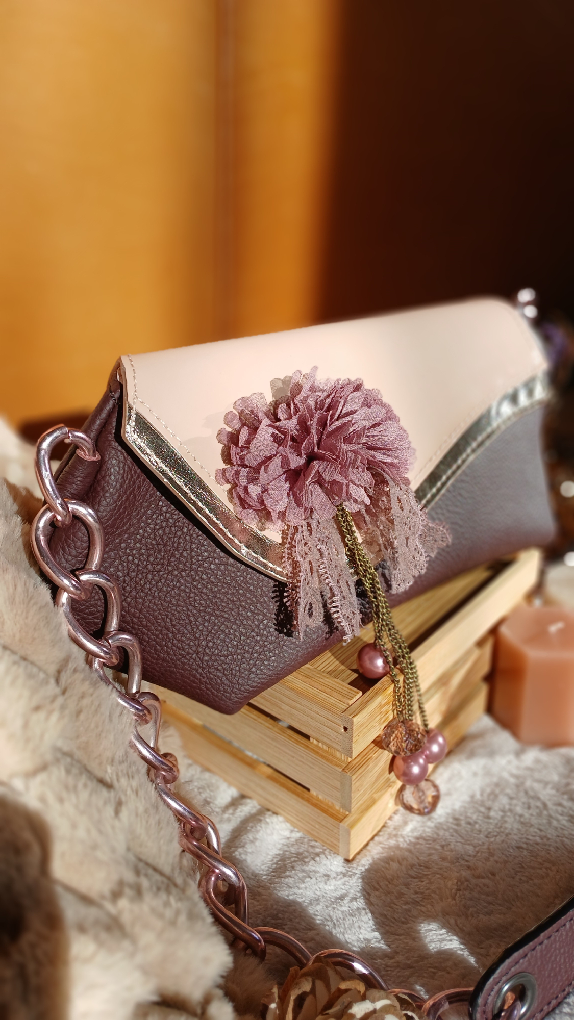 Le sac « Poudré » en cuir upcyclé incarne l’alliance parfaite entre élégance et écoresponsabilité. Fabriqué à partir de cuir upcyclé, il témoigne d’une démarche éthique et créative, idéale pour celles qui recherchent un accessoire à la fois chic et respectueux de l’environnement. Sa partie principale, en cuir prune foncé, offre une profondeur subtile et sophistiquée. Le rabat, délicatement cousu à la main, reflète toute l’attention portée aux détails. Il associe un cuir ciré couleur peau poudrée et un cuir argenté, créant un jeu harmonieux de contrastes et de lumières. Le bijou du sac, anciennement un collier, a été réinventé et cousu à la main sur le rabat. Ce détail unique confère au sac toute son identité et incarne la signature si particulière d’Occi‑Tanne. Vous l’aurez compris, le sac « Poudré » en cuir surcyclé est une œuvre singulière, pensée pour sublimer votre quotidien avec une touche de sophistication et une conscience éthique.