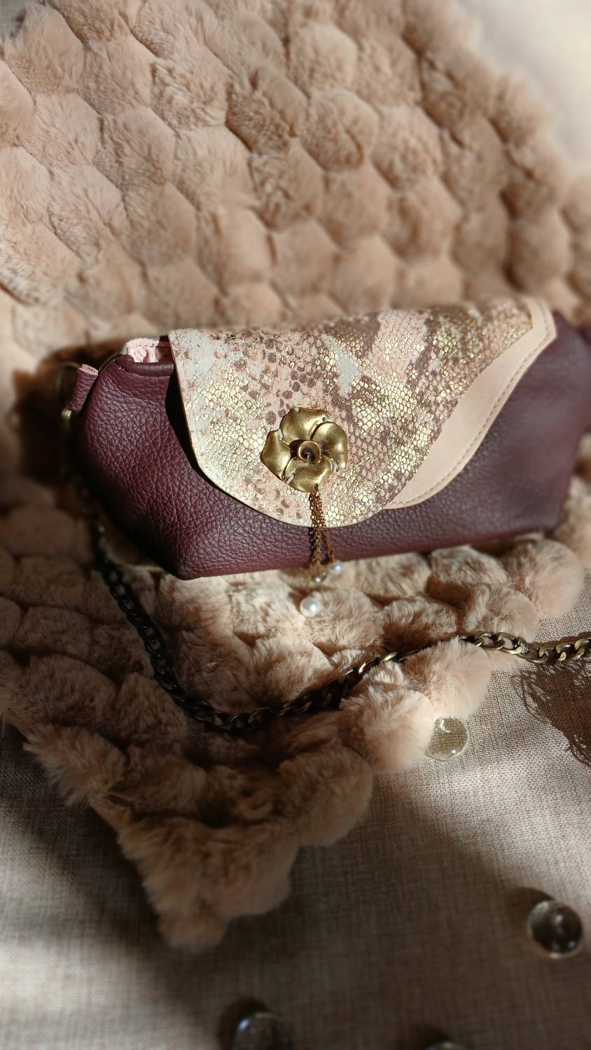 Le sac « Roséa » en cuir surcyclé allie élégance et écoresponsabilité. Avec ses teintes aubergine et rosé, son rabat effet peau de serpent et son bijou rose en bronze, il incarne le raffinement artisanal. Son intérieur délicat, sa bandoulière ajustable et son design unique font de lui un complice parfait pour un style chic et durable. Plus de description via le lien